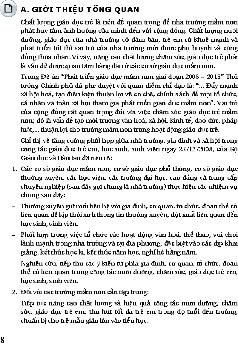 Giáo dục mầm non là bậc học đầu tiên của hệ thống giáo dục quốc dân, có vai trò đặc biệt quan trọng trong việc đặt nền móng cho sự hình thành và phát triển của nhân cách con người. Chính vì thế, hầu hết các quốc gia và các tổ chức quốc tế đều xác định giáo dục mầm non là một mục tiêu quan trọng của giáo dục cho mọi người.