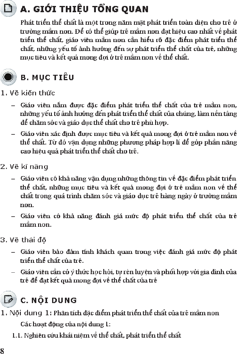 Module Mầm non 1: Đặc điểm phát triển thể chất, những mục tiêu và kết quả mong đợi ở trẻ mầm non về thể chất giúp học viên nắm được đặc điểm phát triển thể chất của trẻ mầm non, những yếu tố ảnh hưởng đến phát triển thể chất của chúng, làm nền tàng để chăm sóc và giáo dục thể chất cho trẻ phù hợp,...