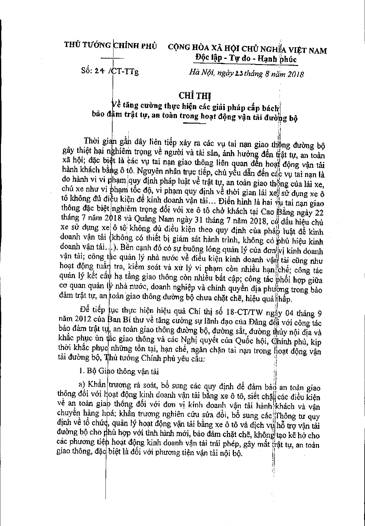 Ngày 23/8/2018, Thủ tướng Chính phủ đã ban hành Chỉ thị 24/CT-TTg về tăng cường thực hiện các giải pháp cấp bách bảo đảm trật tự, an toàn trong hoạt động vận tải đường bộ.