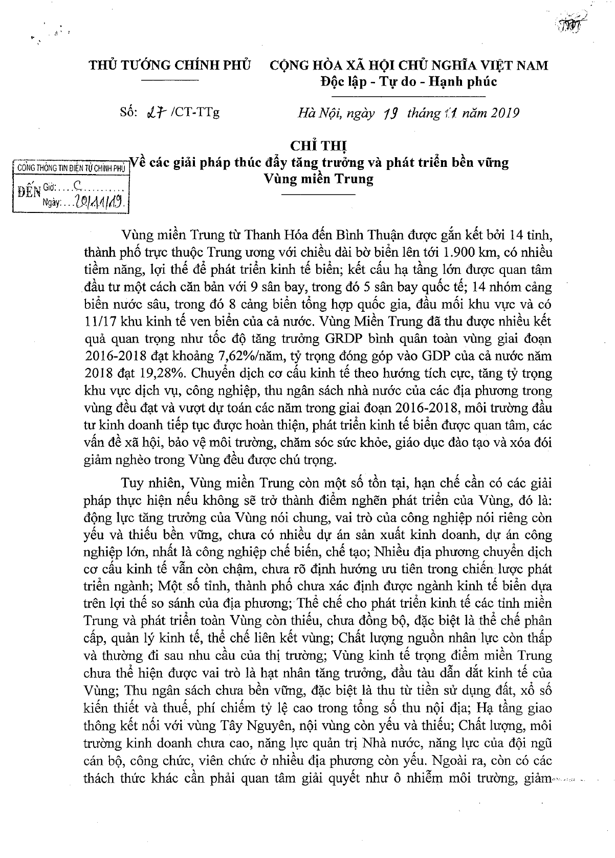 Chỉ thị 27/CT-TTg của Thủ tướng Chính phủ về các giải pháp thúc đẩy tăng trưởng và phát triển bền vững Vùng miền Trung.