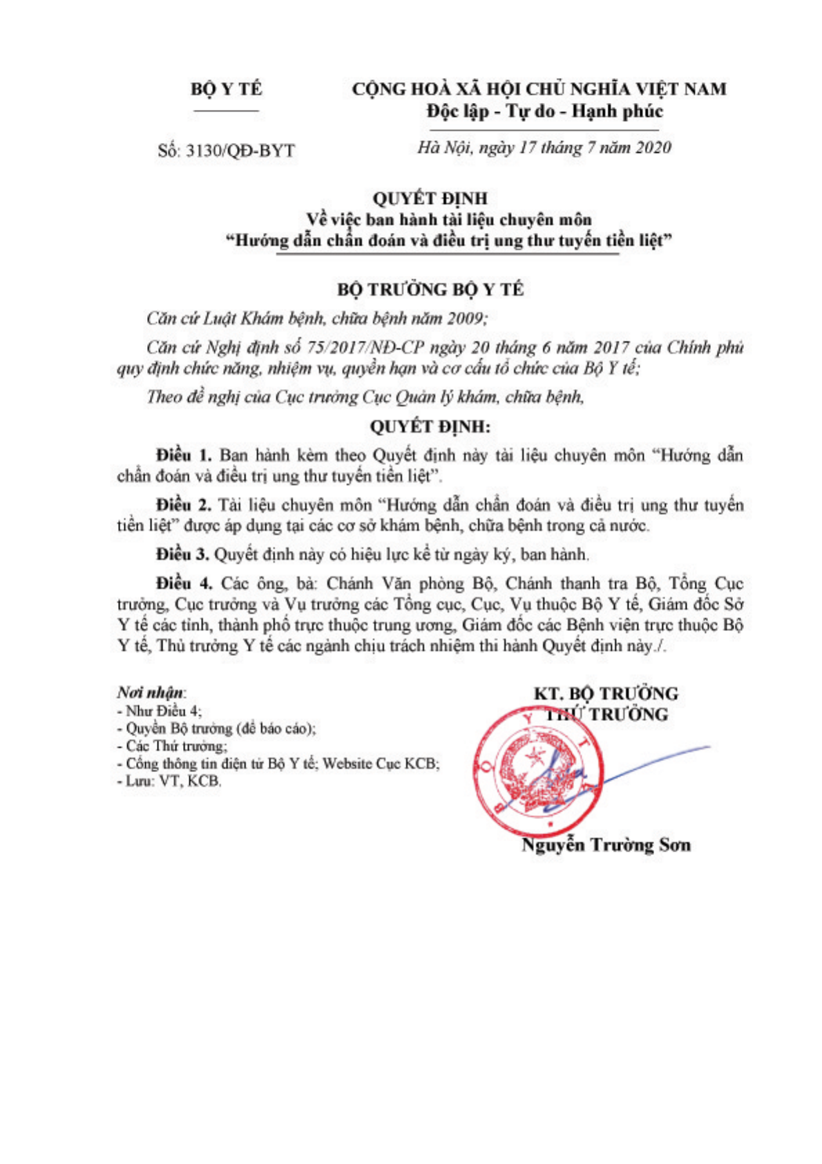 Ngày 17/7/2020, Bộ Y tế đã ra Quyết định 3130/QĐ-BYT về việc ban hành Tài liệu chuyên môn "Hướng dẫn chẩn đoán và điều trị ung thư tuyến tiền liệt".