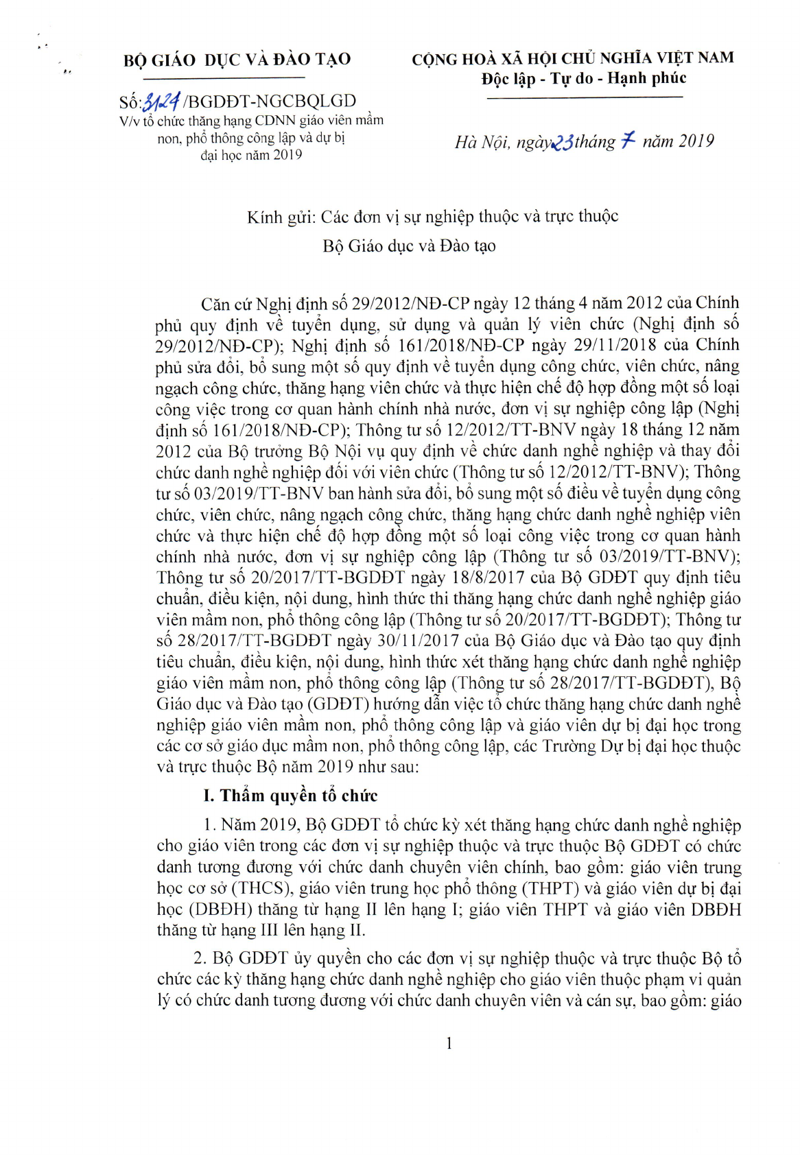 Bộ giáo dục và đào tạo ban hành công văn về việc tổ chức xét thăng hạng chức danh nghề nghiệp giáo viên mầm non, phổ thông công lập và dự bị đại học năm 2019. Sau đây là nội dung chi tiết công văn, mời các bạn cùng theo dõi.