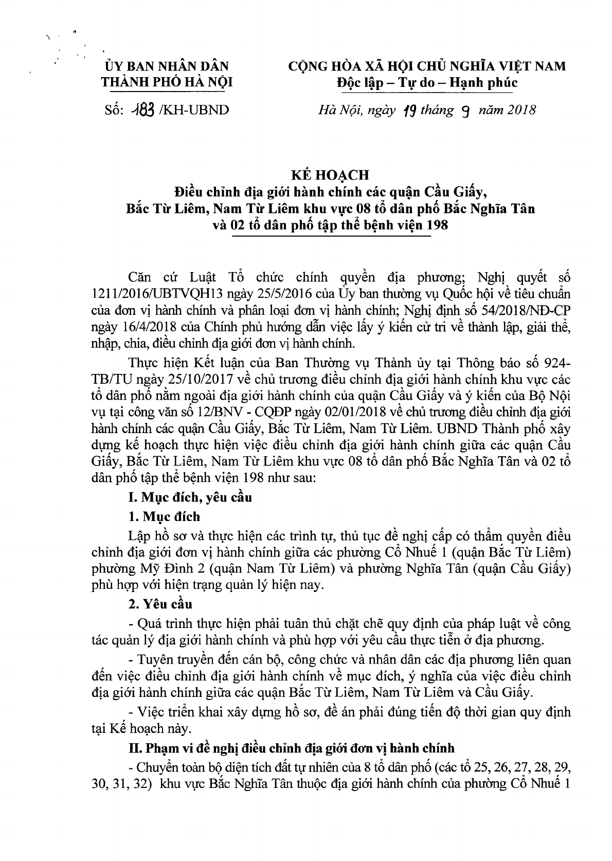 Kế hoạch 183/KH-UBND của Ủy ban nhân dân Thành phố Hà Nội về việc điều chỉnh địa giới hành chính các quận Cầu Giấy, Bắc Từ Liêm, Nam Từ Liêm khu vực 08 tổ dân phố Bắc Nghĩa Tân và 02 tổ dân phố tập thể Bệnh viện 198.