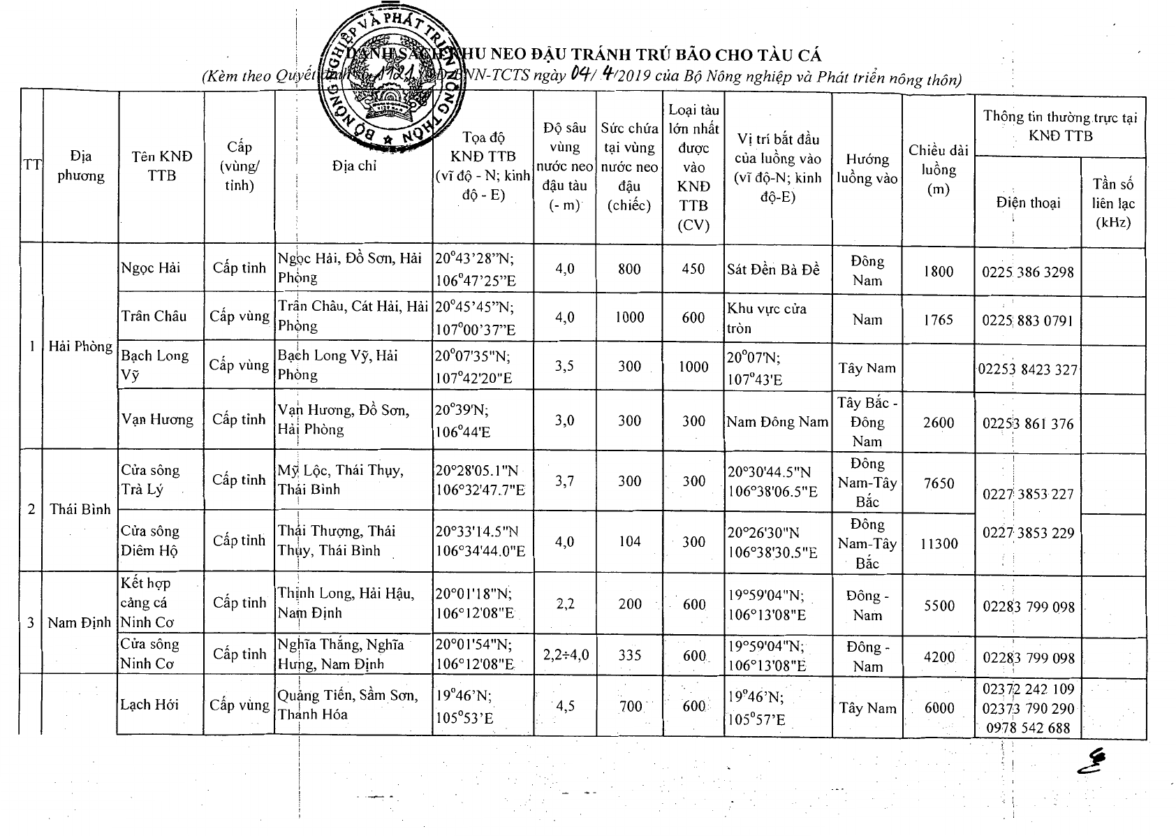 Ngày 04/04/2019, Bộ Nông nghiệp và Phát triển nông thôn ban hành Quyết định 1121/QĐ-BNN-TCTS công bố danh sách khu neo đậu tránh trú bão cho tàu cá năm 2019.