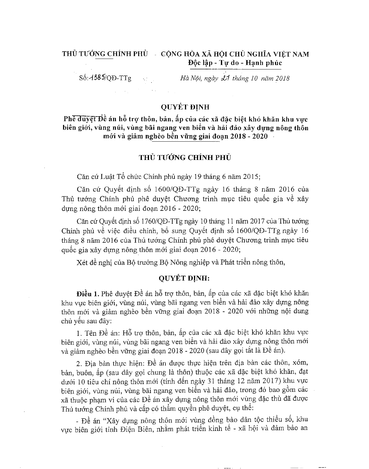 Quyết định 1385/QĐ-TTg năm 2018 về phê duyệt đề án hỗ trợ thôn, bản, ấp của các xã đặc biệt khó khăn khu vực biên giới, vùng núi, vùng bãi ngang ven biển và hải đảo xây dựng nông thôn mới và giảm nghèo bền vững giai đoạn 2018-2020 do thủ tướng chính phủ ban hành.
