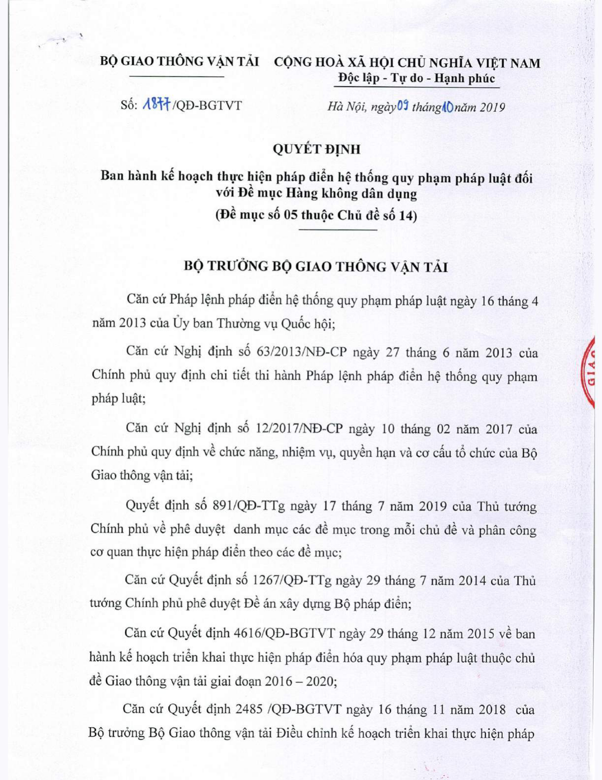 Quyết định 1877/QĐ-BGTVT của Bộ Giao thông Vận tải về việc ban hành Kế hoạch thực hiện pháp điển hệ thống quy phạm pháp luật đối với Đề mục Hàng không dân dụng (Đề mục số 05 thuộc Chủ đề số 14).