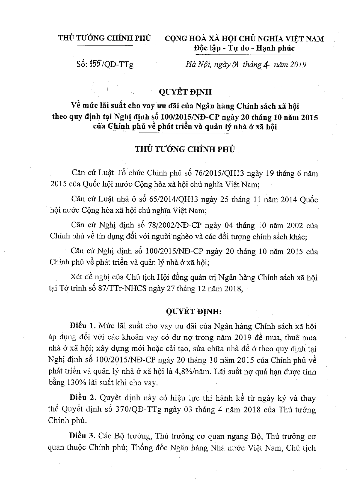 Thủ tướng Chính phủ đã ban hành Quyết định 355/QĐ-TTg về mức lãi suất cho vay ưu đãi của Ngân hàng Chính sách xã hội theo quy định tại Nghị định 100/2015/NĐ-CP ngày 20/10/2015 của Chính phủ về phát triển và quản lý nhà ở xã hội ngày 01/04/2019.