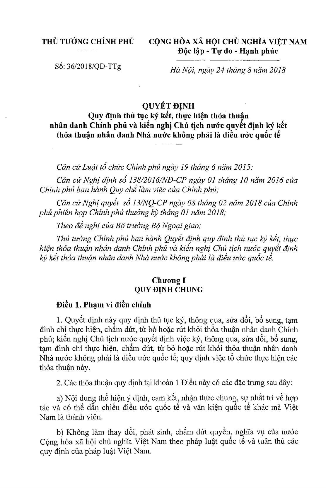 Quyết định 36/2018/QĐ-TTg về thủ tục ký kết, thực hiện thỏa thuận nhân danh Chính phủ và kiến nghị Chủ tịch nước quyết định ký kết thỏa thuận nhân danh Nhà nước không phải là điều ước quốc tế do thủ tướng Chính phủ ban hành.