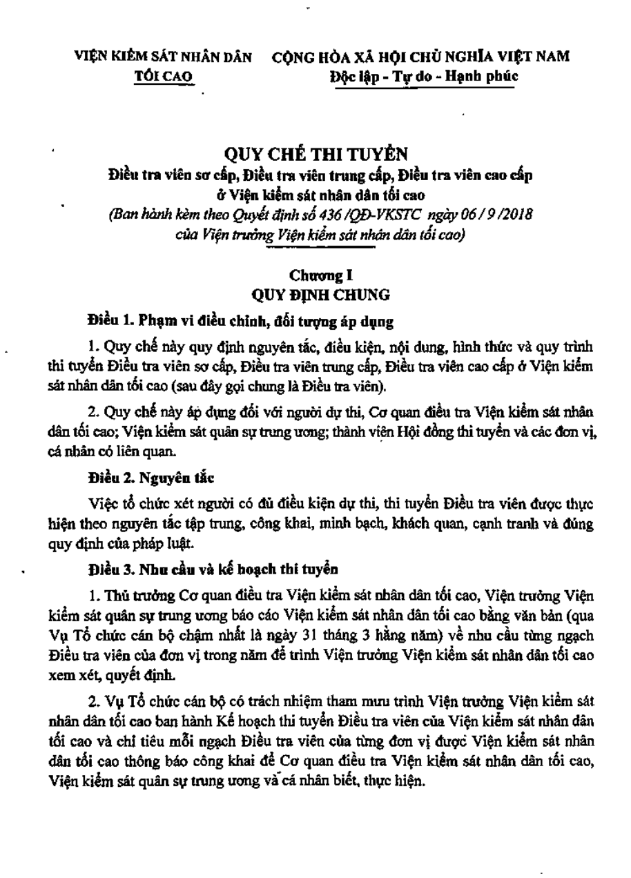 Quyết định 436/QĐ-VKSTC năm 2018 - Quy chế thi tuyển điều tra viên