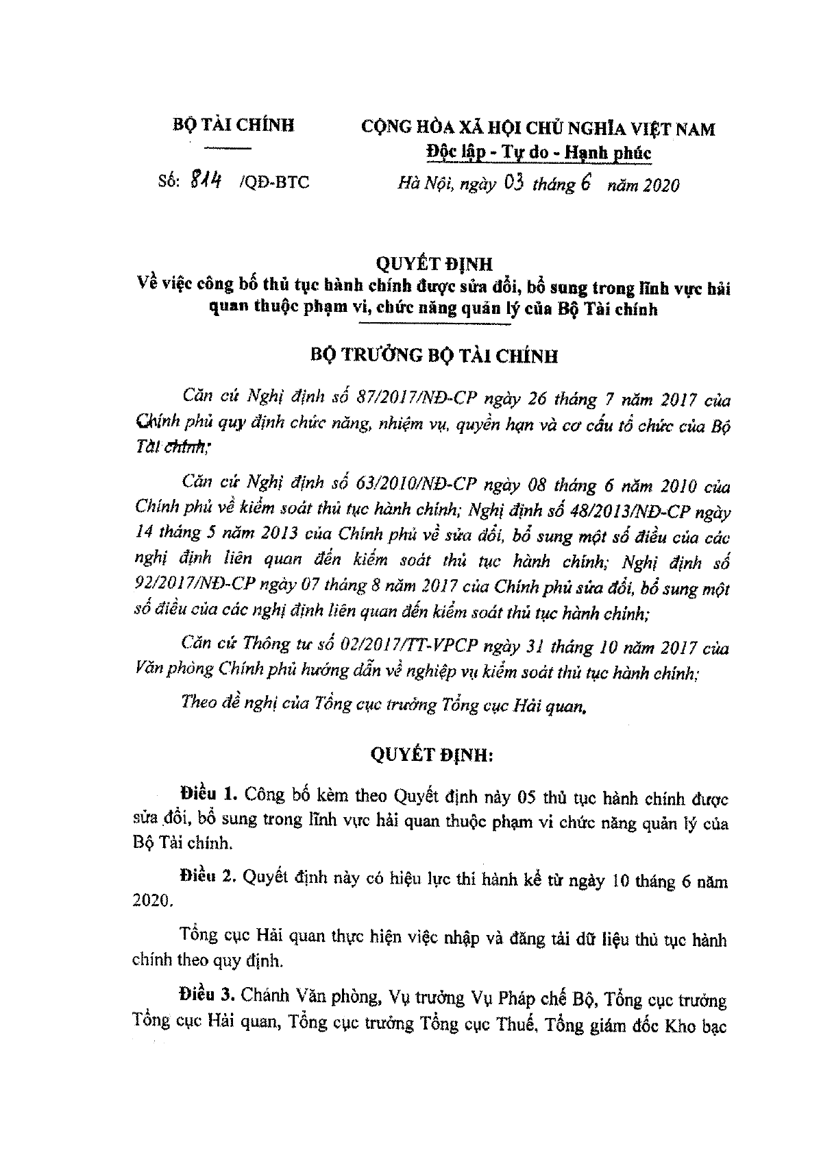 Quyết định số 814/QĐ-BTC 2020
