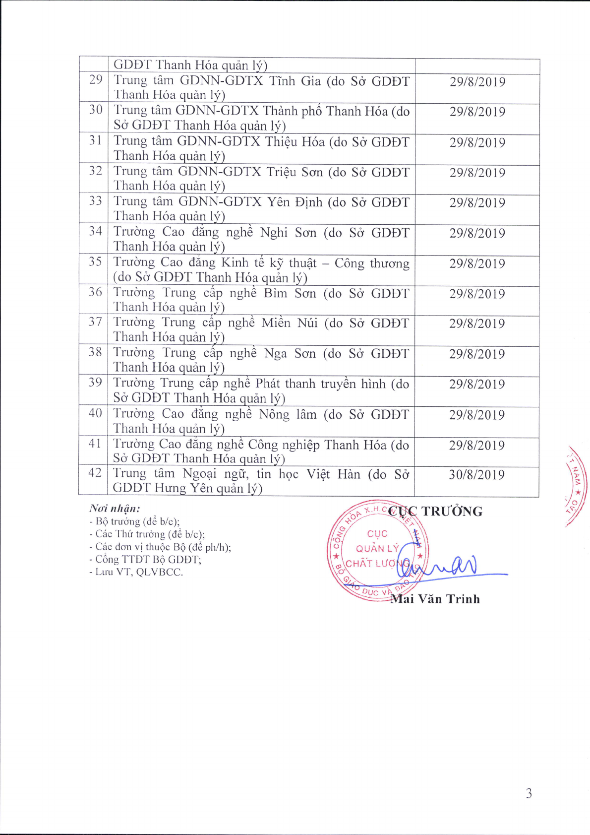 Các Trung tâm GDNN - GDTX Bá Thước, Đông Sơn, Hà Trung, Hoằng Hóa, Nông Cống, Như Thanh, Quảng Xương, Tĩnh Gia, Thành phố Thanh Hóa, Thiệu Hóa, Triệu Sơn, Yên Định (do Sở GDĐT Thanh Hóa quản lý): Dừng từ ngày 29/8/2019;