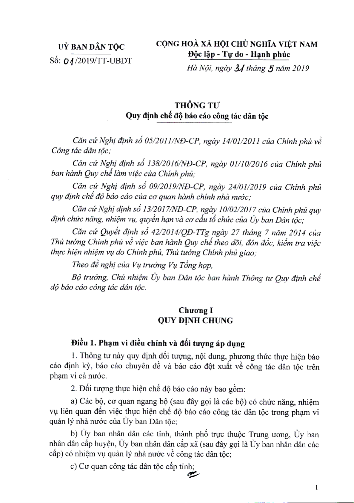 Ngày 31/05/2019, Ủy ban Dân tộc ban hành Thông tư 01/2019/TT-UBDT quy định chế độ báo cáo công tác dân tộc.