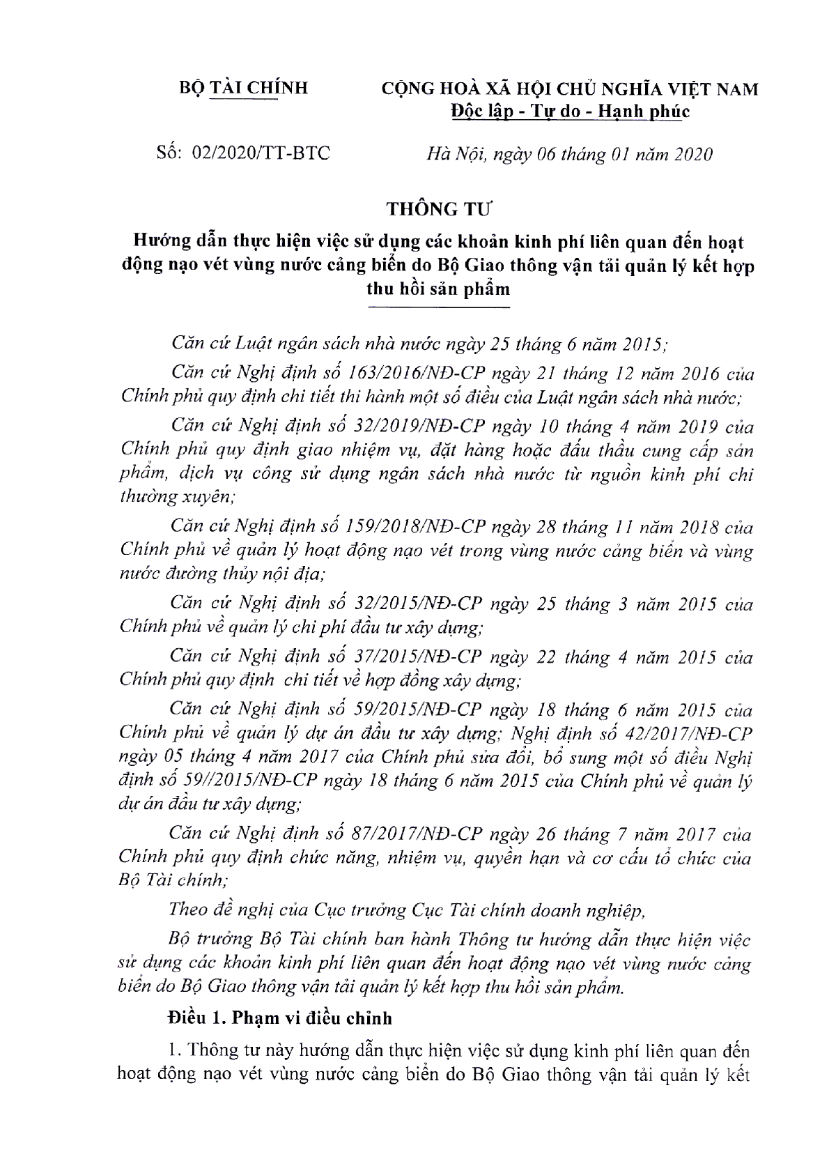 Thông tư 02/2020/TT-BTC của Bộ Tài chính hướng dẫn thực hiện việc sử dụng các khoản kinh phí liên quan đến hoạt động nạo vét vùng nước cảng biển do Bộ Giao thông vận tải quản lý kết hợp thu hồi sản phẩm.