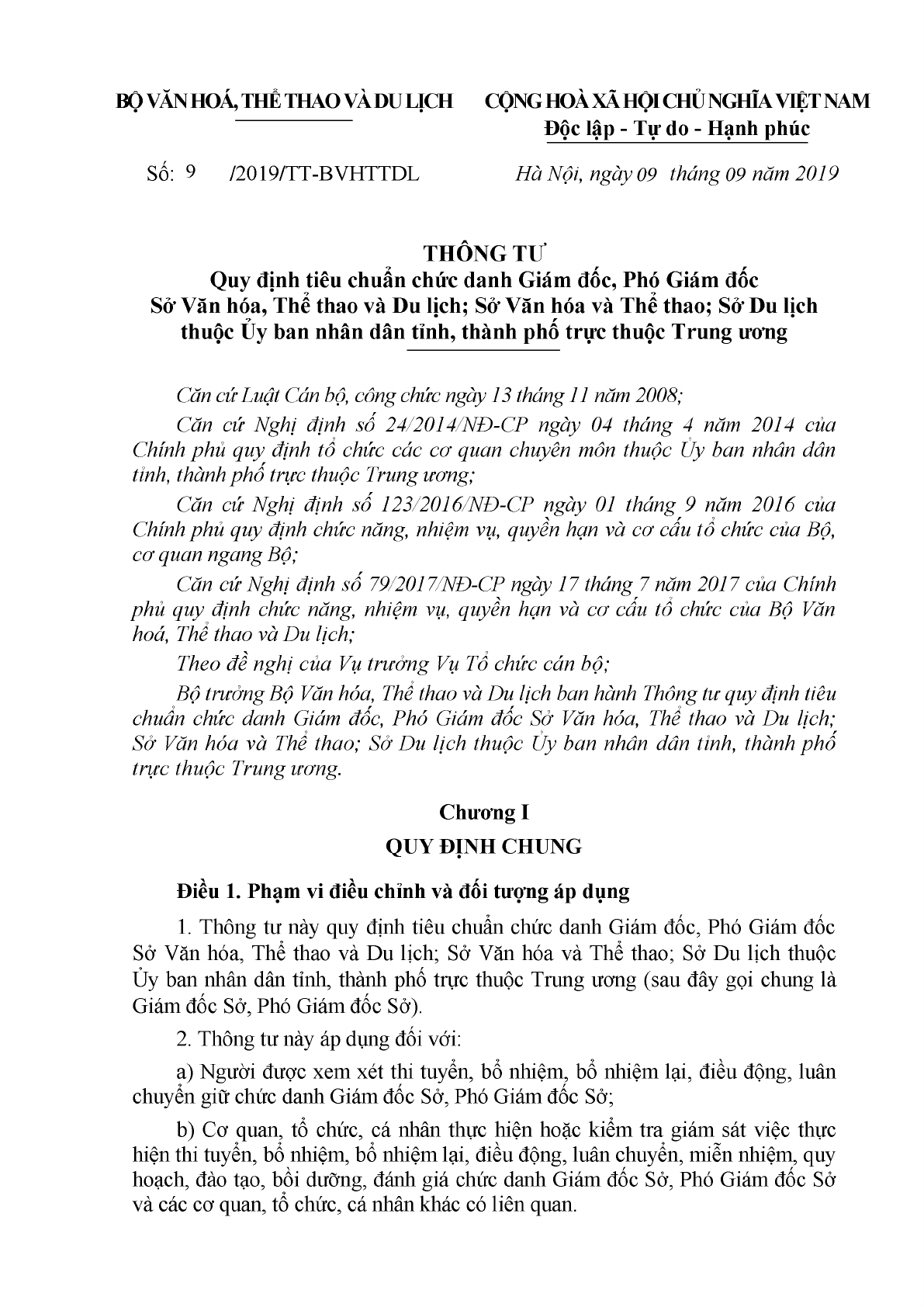 Thông tư 09/2019/TT-BVHTTDL quy định về tiêu chuẩn chức danh giám đốc, phó giám đốc sở văn hóa, thể thao và du lịch; sở văn hóa và thể thao; sở du lịch thuộc ủy ban nhân dân tỉnh, thành phố trực thuộc trung ương do Bộ văn hóa thể thao và du lịch ban hành.