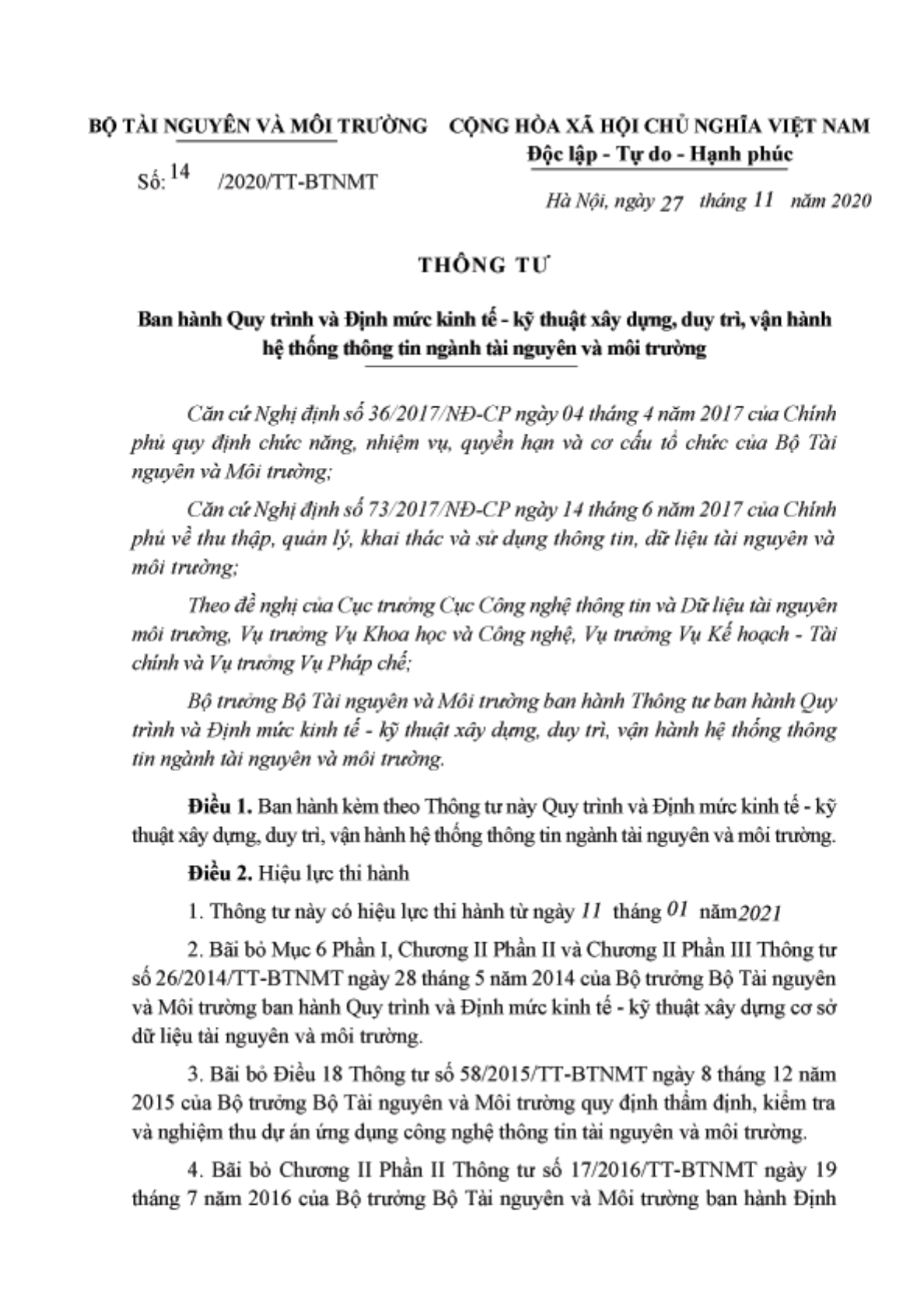 Ngày 27/11/2020, Bộ Tài nguyên và Môi trường ra Thông tư 14/2020/TT-BTNMT về việc ban hành Quy trình và Định mức kinh tế - kỹ thuật xây dựng, duy trì, vận hành hệ thống thông tin ngành tài nguyên và môi trường.