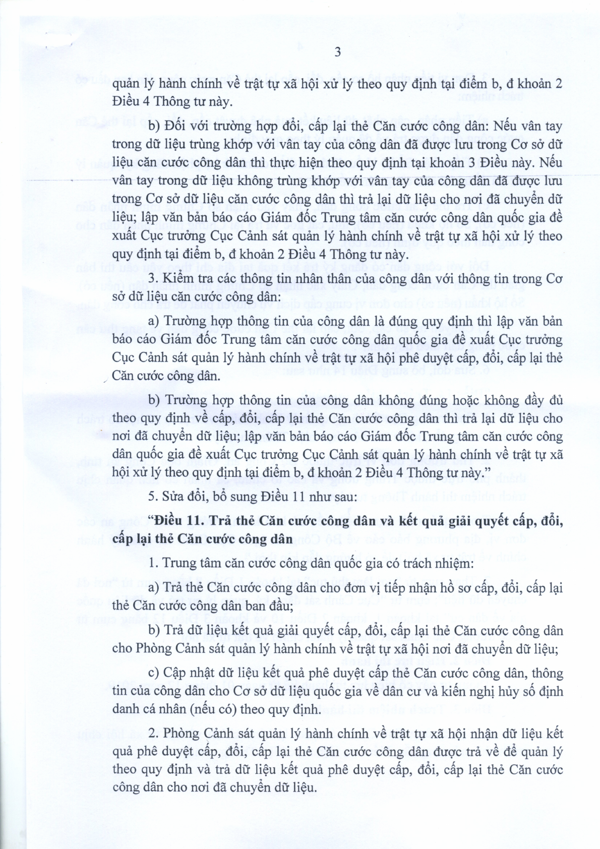 Bổ sung nội dung: "Trường hợp công dân làm thủ tục cấp, đổi, cấp lại thẻ Căn cước công dân tại cơ quan quản lý căn cước công dân cấp huyện cần điều chỉnh những thay đổi trong Sổ hộ khẩu mà việc điều chỉnh này thuộc thẩm quyền của Công an cấp huyện và công dân xuất trình được đầy đủ giấy tờ hợp lệ theo quy định của pháp luật về cư trú tiếp nhận hồ sơ điều chỉnh những thay đổi trong Sổ hộ khẩu của công dân đồng thời với việc tiếp nhận hồ sơ cấp, đổi, cấp lại thẻ Căn cước công dân".