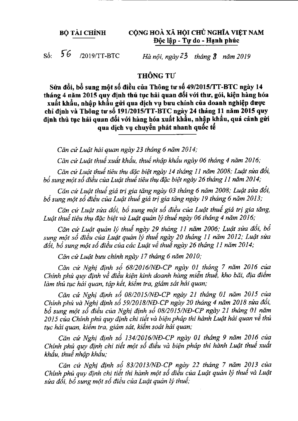 Thông tư 56/2019/TT-BTC của Bộ Tài chính về việc sửa đổi, bổ sung một số điều của Thông tư 49/2015/TT-BTC ngày 14/4/2015 quy định thủ tục hải quan đối với thư, gói, kiện hàng hóa xuất khẩu, nhập khẩu gửi qua dịch vụ bưu chính của doanh nghiệp được chỉ định và Thông tư 191/2015/TT-BTC ngày 24/11/2015 quy định thủ tục hải quan đối với hàng hóa xuất khẩu, nhập khẩu, quá cảnh gửi qua dịch vụ chuyển phát nhanh quốc tế.