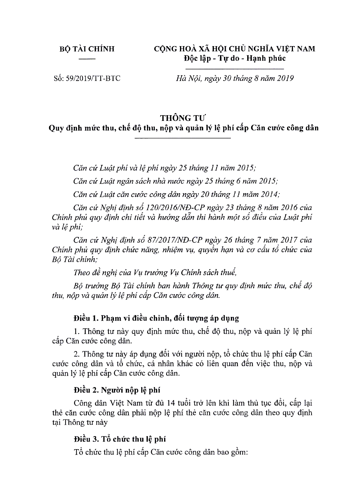 Thông tư 59/2019/TT-BTC của Bộ Tài chính về việc quy định mức thu, chế độ thu, nộp và quản lý lệ phí cấp Căn cước công dân.
