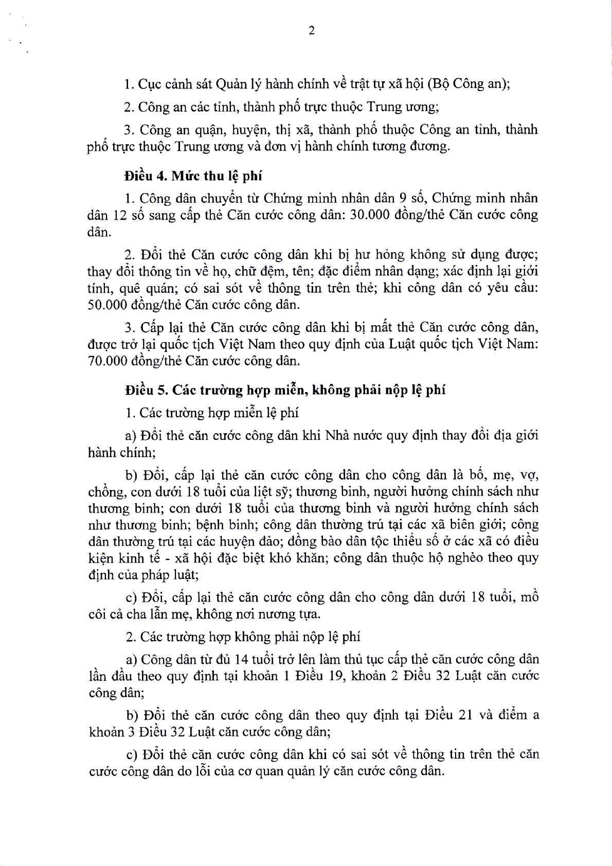 Bên cạnh đó, Thông tư này còn quy định các trường hợp miễn, không phải nộp lệ phí. Cụ thể, được miễn lệ phí khi xin đổi, cấp lại thẻ Căn cước công dân khi công dân là bố, mẹ, vợ, chồng, con dưới 18 tuổi của liệt sỹ; thương binh, người hưởng chính sách như thương binh; bệnh binh; công dân thường trú tại các xã biên giới; công dân thường trú tại các huyện đảo;…