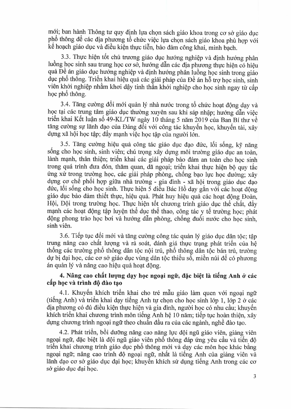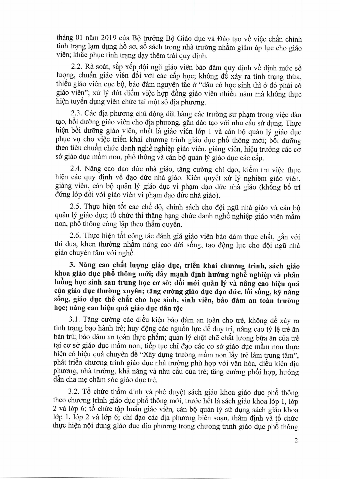 Bên cạnh đó, Bộ cũng yêu cầu các đơn vị, cơ sở nâng cao chất lượng giáo dục, triển khai chương trình, sách giáo khoa mới, đẩy mạnh định hướng nghề nghiệp và phân luồng học sinh sau trung học cơ sở; Nâng cao chất lượng dạy học ngoại ngữ ở các cấp học và trình độ đào tạo; Đẩy mạnh ứng dụng công nghệ thông tin trong quản lý giáo dục…
