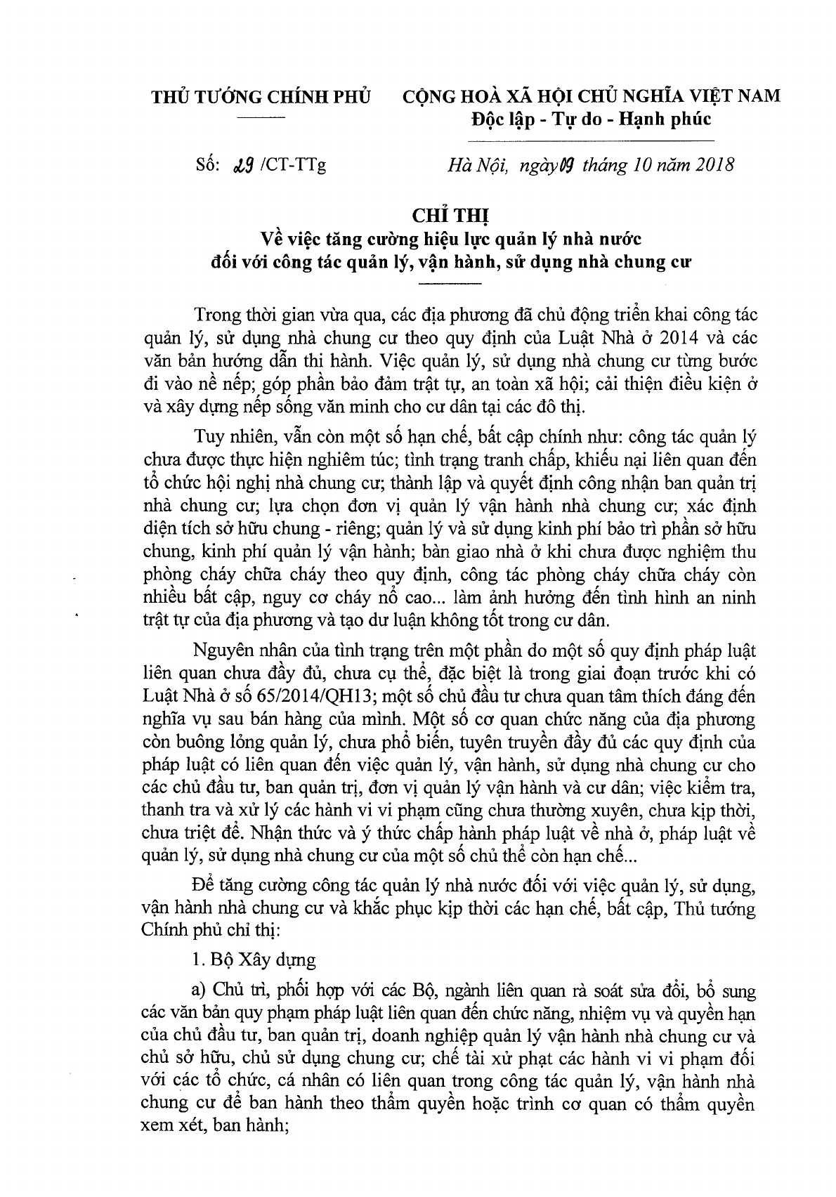 Chỉ thị 29/CT-TTg của Thủ tướng Chính phủ về việc tăng cường hiệu lực quản lý Nhà nước đối với công tác quản lý, vận hành, sử dụng nhà chung cư.