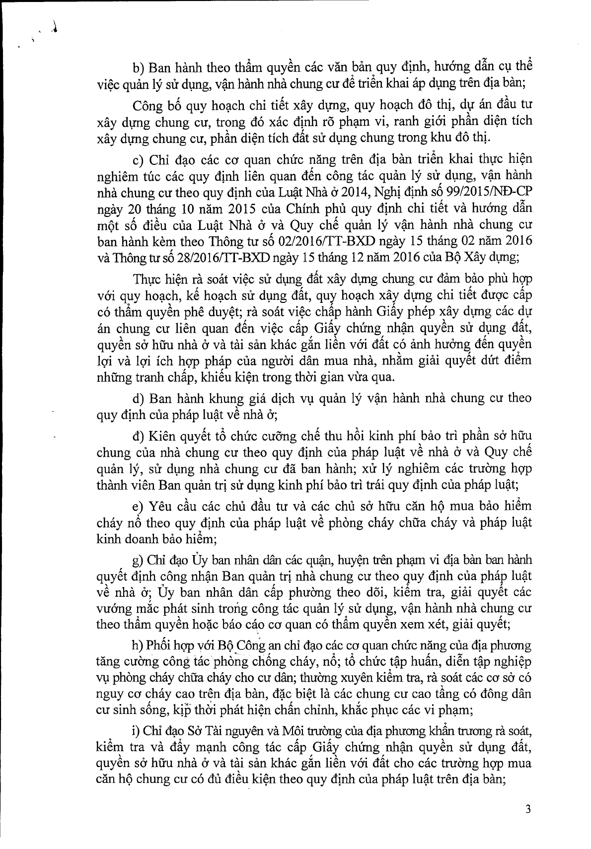 Bên cạnh đó, UBND cấp tỉnh cũng cần ban hành khung giá dịch vụ quản lý vận hành nhà chung cư theo quy định; Đẩy mạnh cấp Giấy chứng nhận quyền sử dụng đất, quyền sở hữu nhà ở và tài sản khác gắn liền với đất cho các trường hợp mua căn hộ chung cư có đủ điều kiện…