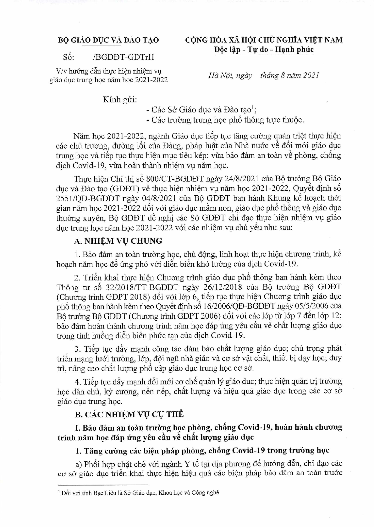 Công văn 3699/BGDĐT-GDTrH về hướng dẫn thực hiện nhiệm vụ năm học 2021-2022 trung học