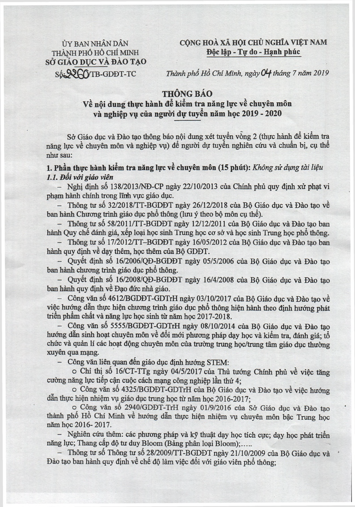 Sở giáo dục thành phố Hồ Chí Minh thông báo về nội dung thực hành để kiểm tra về năng lực chuyên môn và nghiệp vụ của người dự tuyển năm học 2019-2020. Sau đây là nội dung chi tiết đề cương ôn thi viên chức vòng 2 của thành phố Hồ Chí Minh 2019, mời các bạn cùng theo dõi.