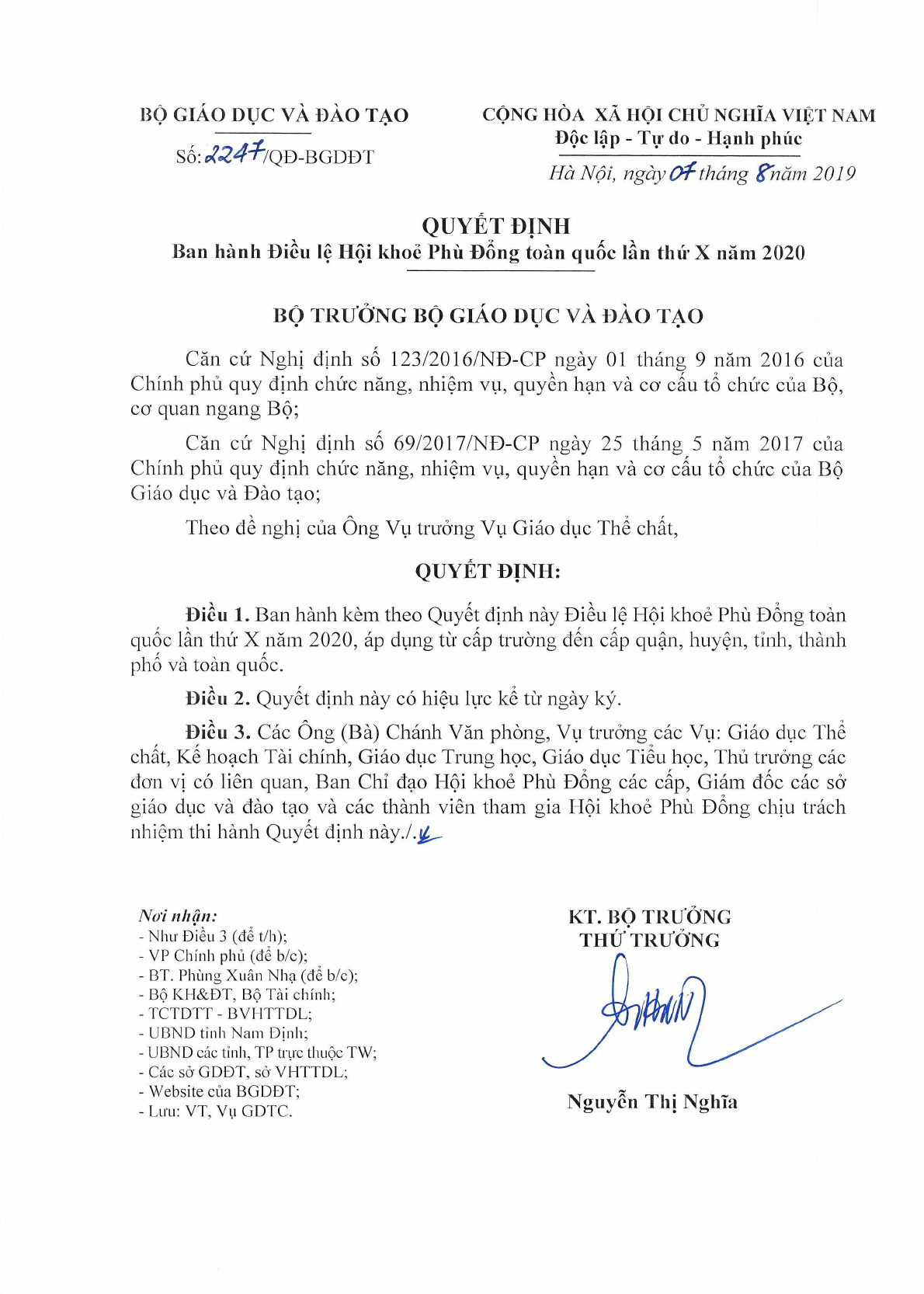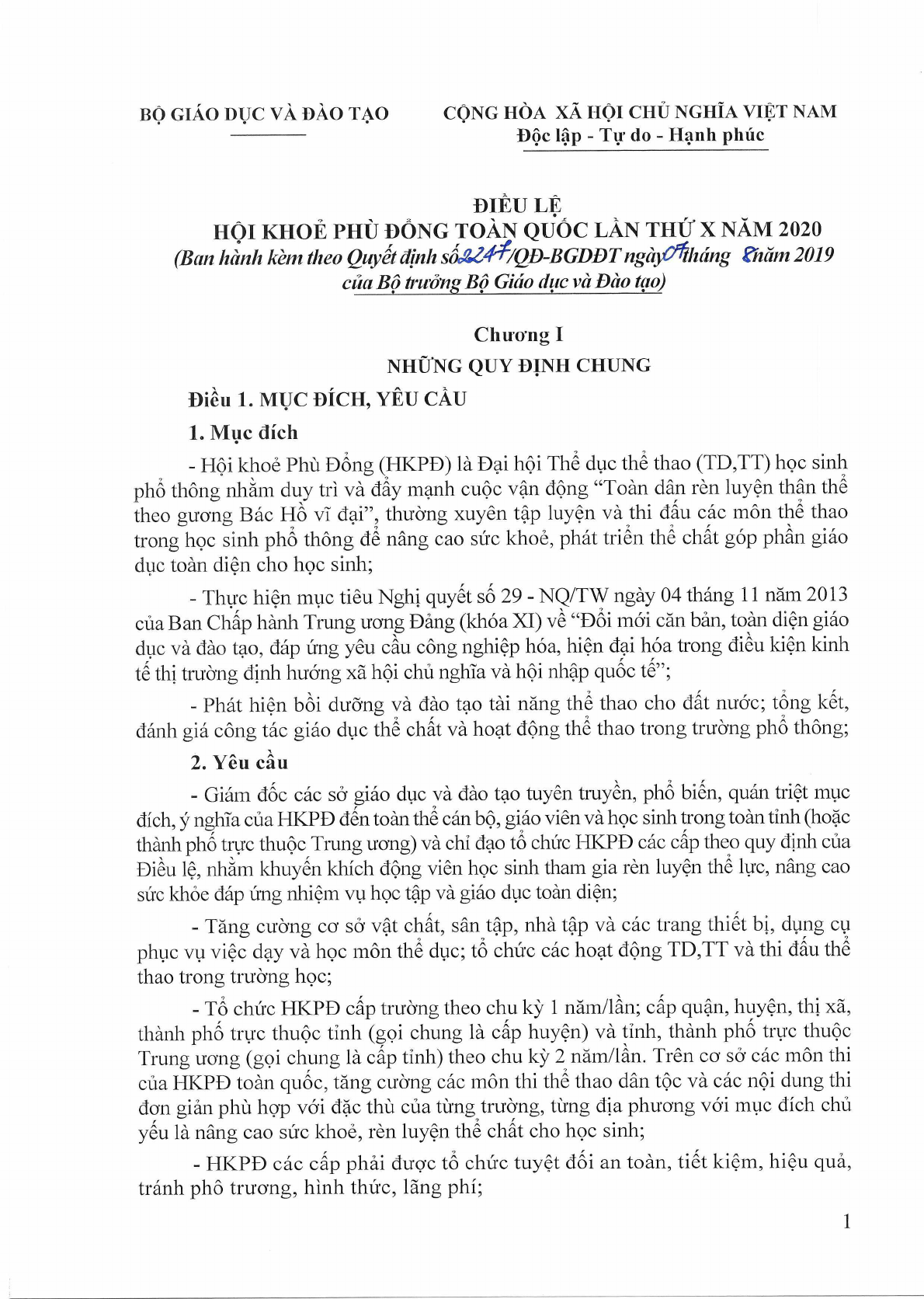 Quyết định 2247/QĐ-BGDĐT của Bộ Giáo dục và Đào tạo về việc ban hành Điều lệ Hội khỏe Phù Đổng toàn quốc lần thứ X năm 2020.