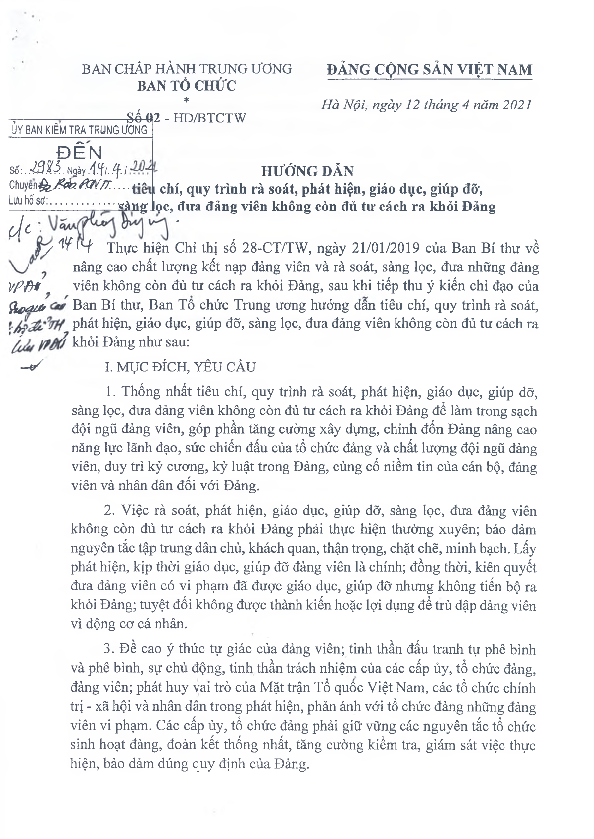 Hướng dẫn 02-HD/BTCTW được ban hành ngày 12/4/2021.