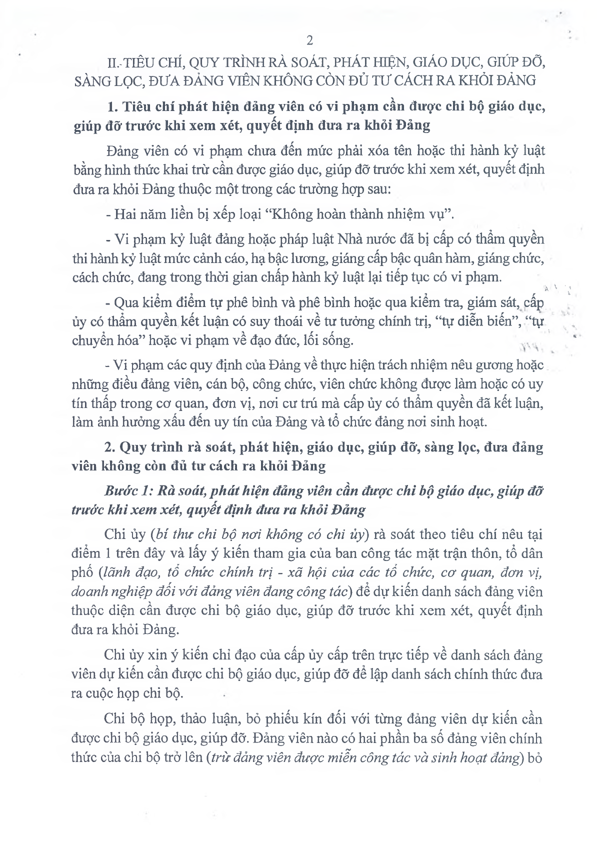 Chi ủy (bí thư chi bộ nơi không có chỉ ủy) rà soát theo tiêu chí nêu tại điểm 1 Mục II Hướng dẫn này và lấy ý kiến tham gia của ban công tác mặt trận thôn, tổ dân phố (lãnh đạo, tố chức chính trị - xã hội của các tổ chức, cơ quan, đơn vị, doanh nghiệp đối với đảng viên đang công tác) để dự kiến danh sách đảng viên thuộc diện cần được chi bộ giáo dục, giúp đỡ trước khi xem xét, quyết định đưa ra khỏi Đảng.