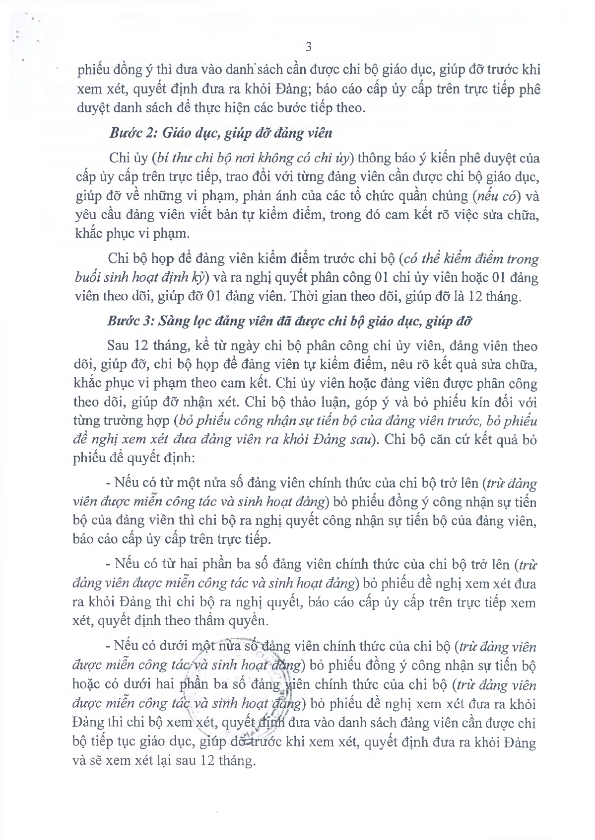 - Nếu có dưới 1/2 số đảng viên chính thức của chi bộ (trừ đảng viên được miễn công tác và sinh hoạt đảng) bỏ phiếu đồng ý công nhận sự tiến bộ hoặc có dưới hai phần ba số đảng viên chính thức của chi bộ (trừ đảng viên được miễn công tác và sinh hoạt đảng) bỏ phiếu đề nghị xem xét đưa ra khỏi Đảng thì chi bộ xem xét, quyết định đưa vào danh sách đảng viên cần được chi bộ tiếp tục giáo dục, giúp đỡ trước khi xem xét, quyết định đưa ra khỏi Đảng và sẽ xem xét lại sau 12 tháng.