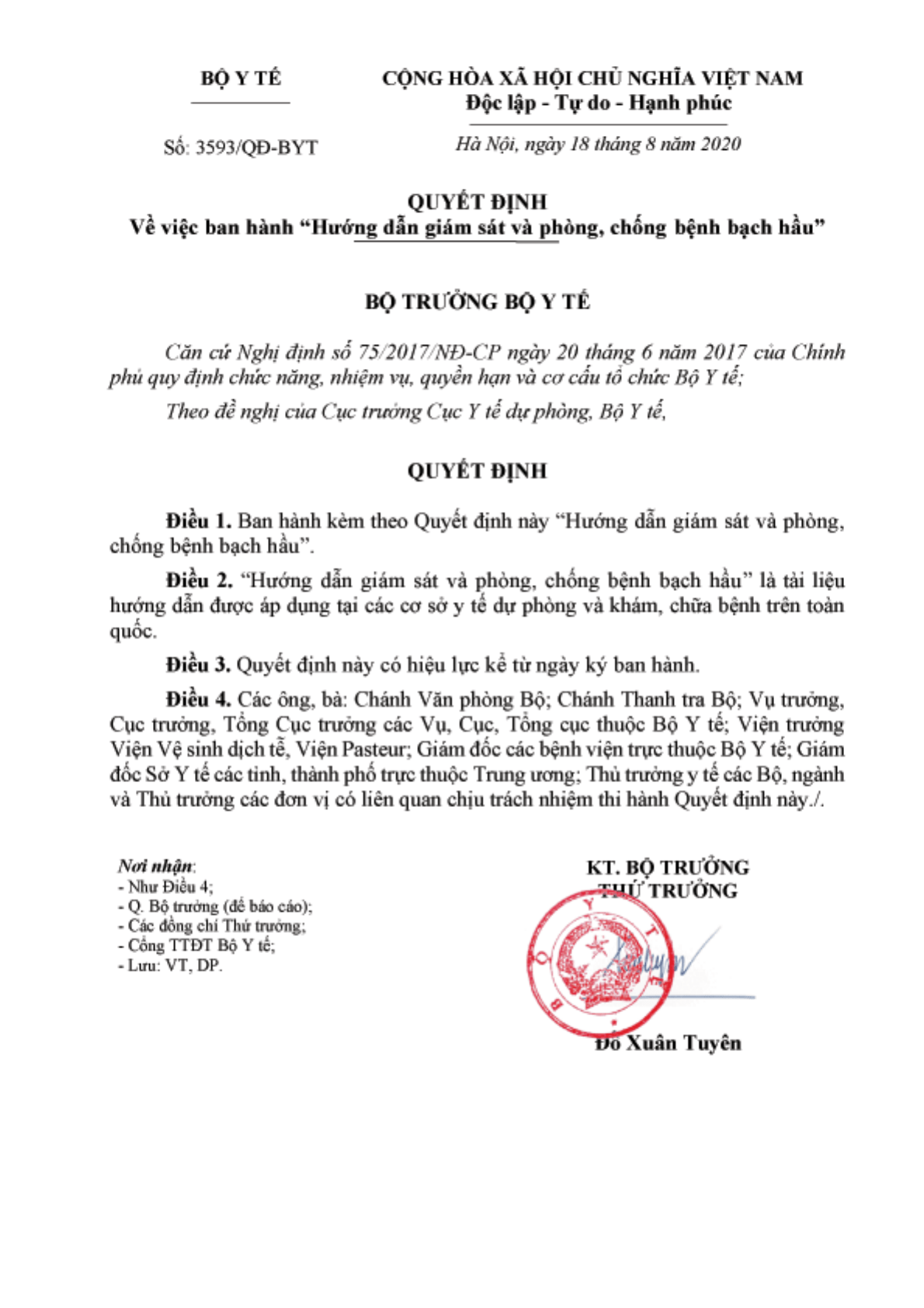 Quyết định 3593/QĐ-BYT của Bộ Y tế về việc ban hành “Hướng dẫn giám sát và phòng, chống bệnh bạch hầu”.