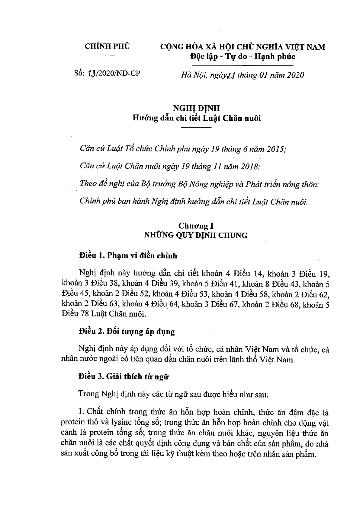 Nghị định 13/2020/NĐ-CP của Chính phủ về việc hướng dẫn chi tiết Luật Chăn nuôi