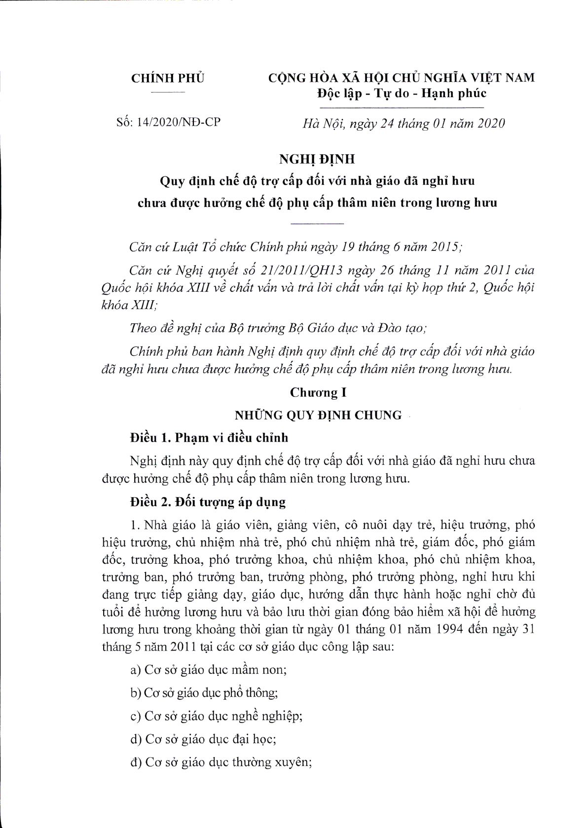 Thủ tướng Chính phủ Nguyễn Xuân Phúc đã ký, ban hành Nghị định số 14/2020/NĐ-CP ngày 24/1/2020 Quy định chế độ trợ cấp đối với nhà giáo đã nghỉ hưu chưa được hưởng trợ cấp chế độ phụ cấp thâm niên trong lương hưu. Nghị định có hiệu lực thi hành từ ngày 15/3/2020.