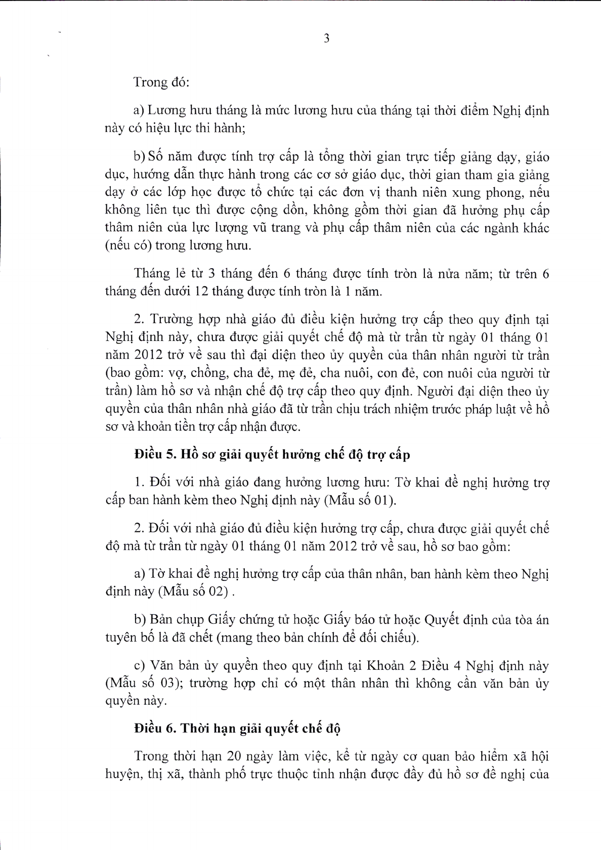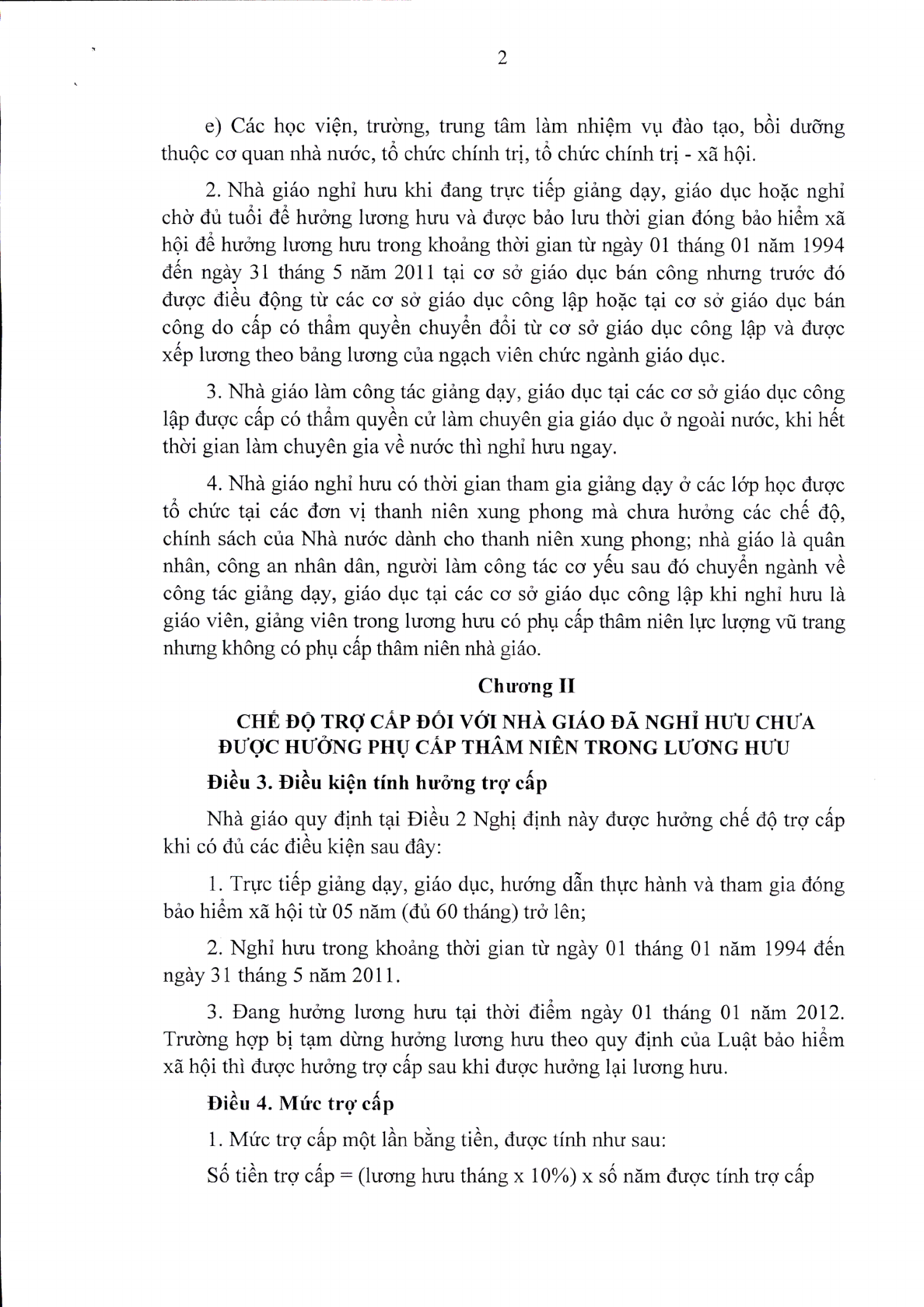 Để được chế độ trợ cấp, các đối tượng phải có đủ các điều kiện trực tiếp giảng dạy, giáo dục, hướng dẫn thực hành và tham gia đóng bảo hiểm xã hội từ 5 năm trở lên; đang hưởng lương hưu tại thời điểm ngày 1/1/2012. Mức trợ cấp được tính bằng (lương hưu tháng x 10%) x số năm được tính trợ cấp với nguồn kinh phí do ngân sách trung ương bảo đảm theo quy định.