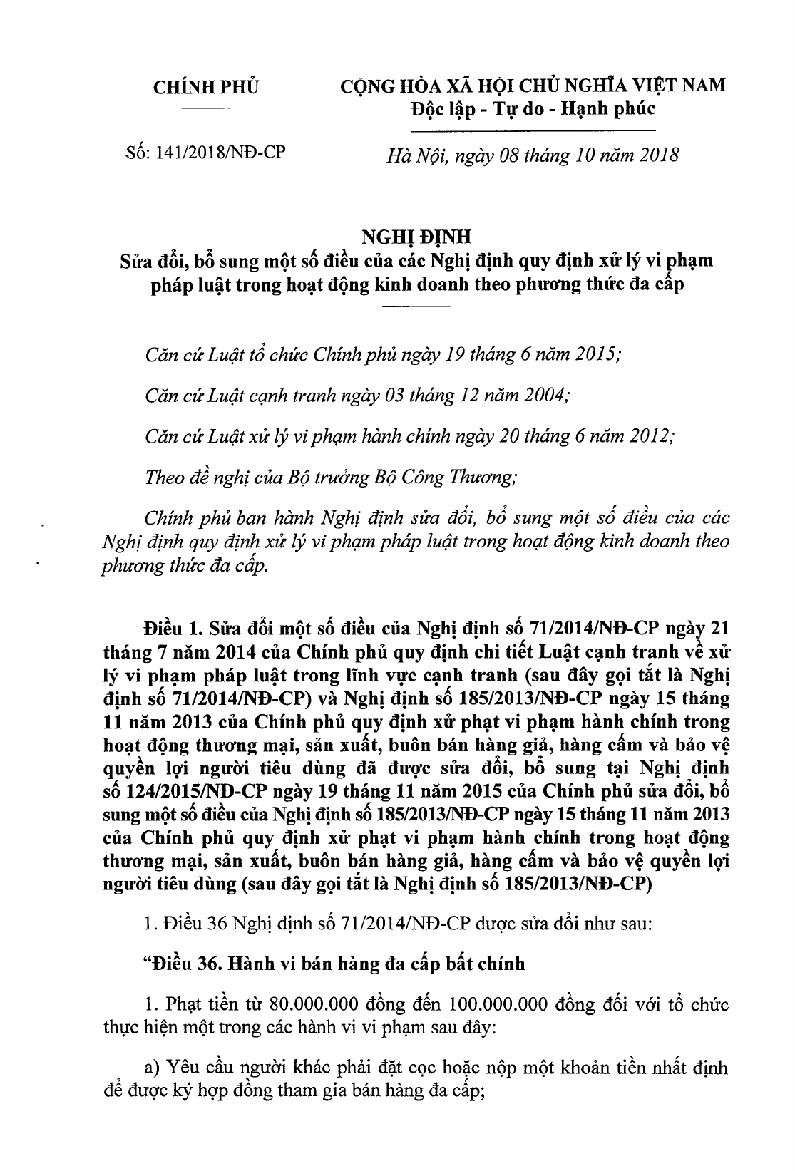 Nghị định 141/2018/NĐ-CP của Chính phủ về việc sửa đổi, bổ sung một số điều của các Nghị định quy định xử lý vi phạm pháp luật trong hoạt động kinh doanh theo phương thức đa cấp.