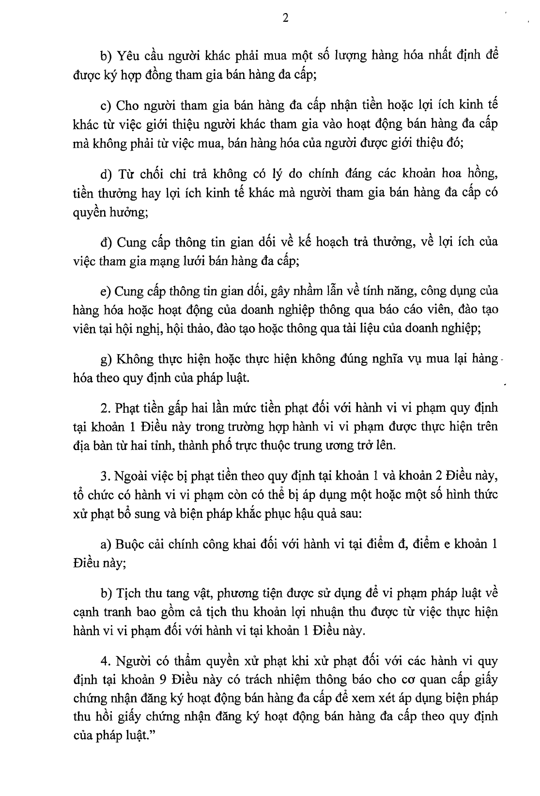 - Cho người tham gia bán hàng đa cấp nhận tiền hoặc lợi ích kinh tế khác từ việc giới thiệu người khác tham gia vào hoạt động bán hàng đa cấp mà không phải từ việc mua, bán hàng hóa của người được giới thiệu đó;…