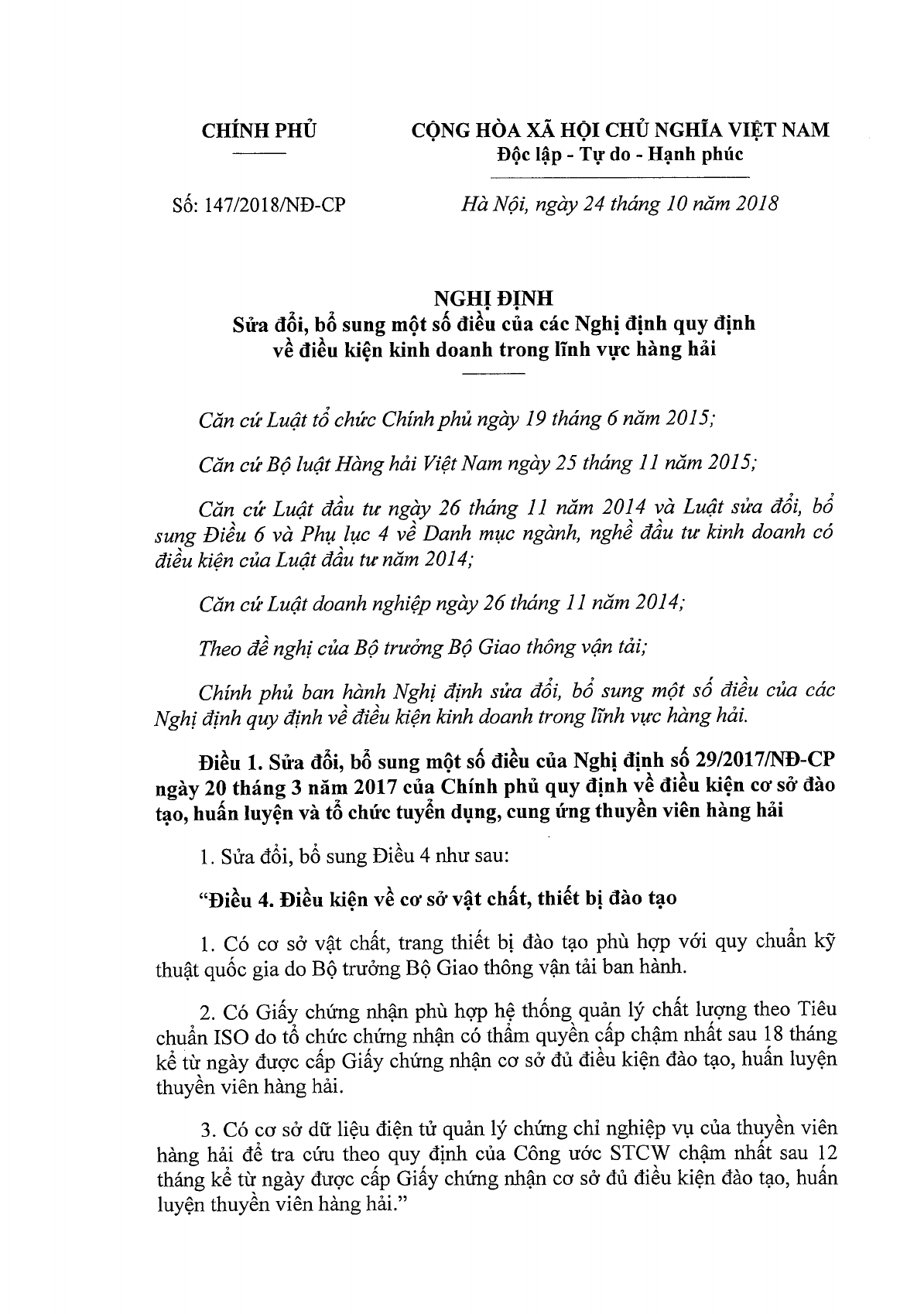 Thủ tướng Chính phủ vừa ban hành Nghị định 147/2018/NĐ-CP về việc sửa đổi nghị định quy định về điều kiện kinh doanh trong lĩnh vực hàng hải.