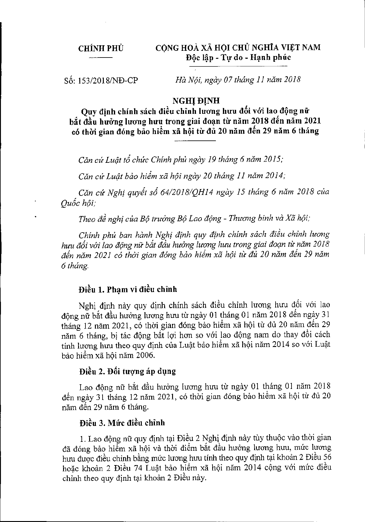 Ngày 07/11/2018, Chính phủ đã ban hành Nghị định 153/2018/NĐ-CP quy định chính sách điều chỉnh lương hưu đối với lao động nữ bắt đầu hưởng lương hưu từ năm 2018 đến năm 2021 có thời gian đóng BHXH từ đủ 20 năm đến 29 năm 06 tháng.