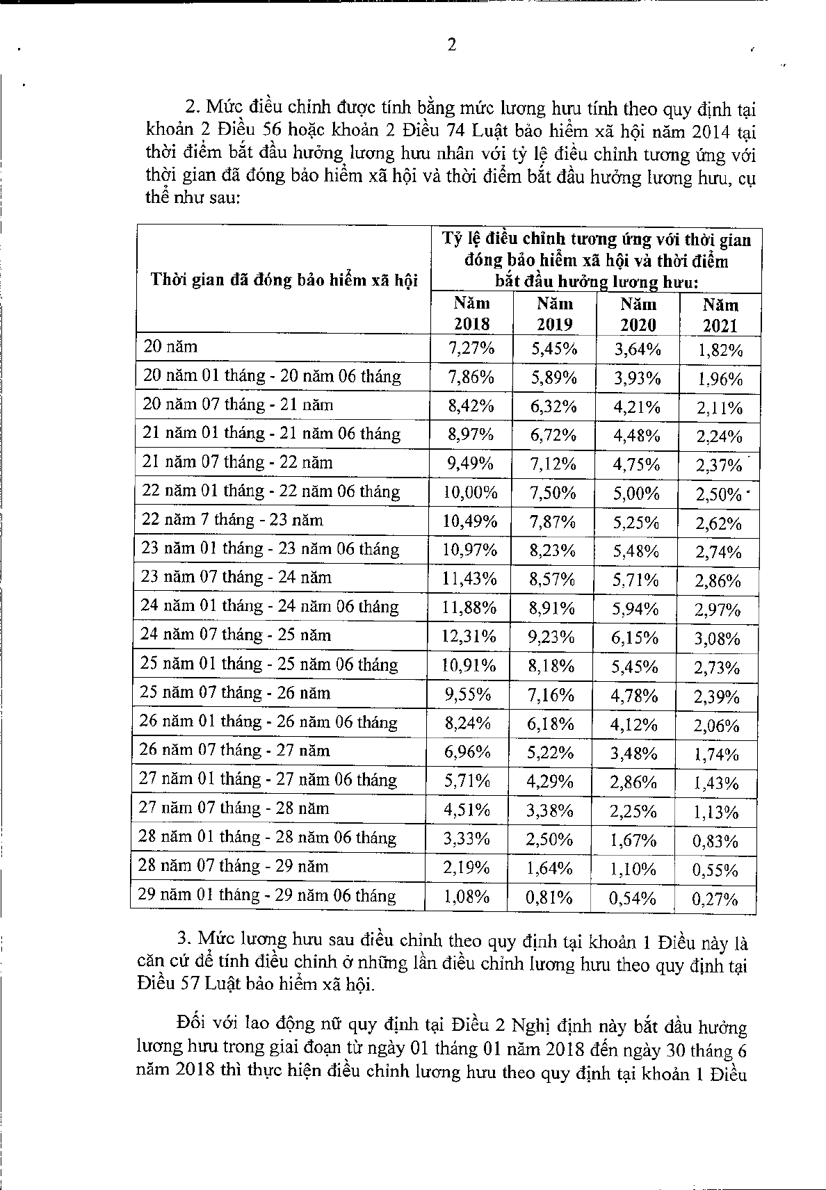 - Nếu nghỉ hưu năm 2021, tỷ lệ điều chỉnh cao nhất là 3,08%, thấp nhất là 0,27%, tùy thuộc vào thời gian đã đóng BHXH.