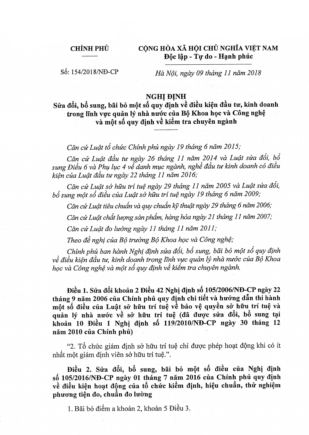 Nghị định 154/2018/NĐ-CP sửa đổi quy định về điều kiện đầu tư, kinh doanh trong lĩnh vực quản lý nhà nước của Bộ khoa học và công nghệ và quy định về kiểm tra chuyên ngành.