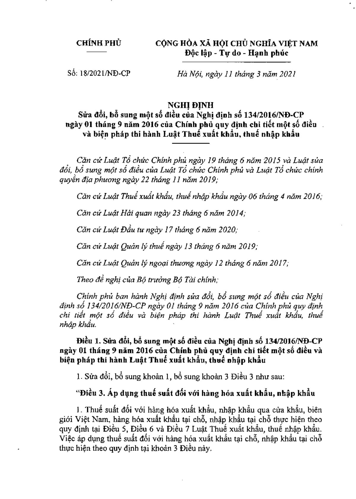 Nghị định 18/2021/NĐ-CP của Chính phủ về việc sửa đổi, bổ sung một số điều của Nghị định 134/2016/NĐ-CP ngày 01/9/2016 của Chính phủ quy định chi tiết một số điều và biện pháp thi hành Luật Thuế xuất khẩu, thuế nhập khẩu.