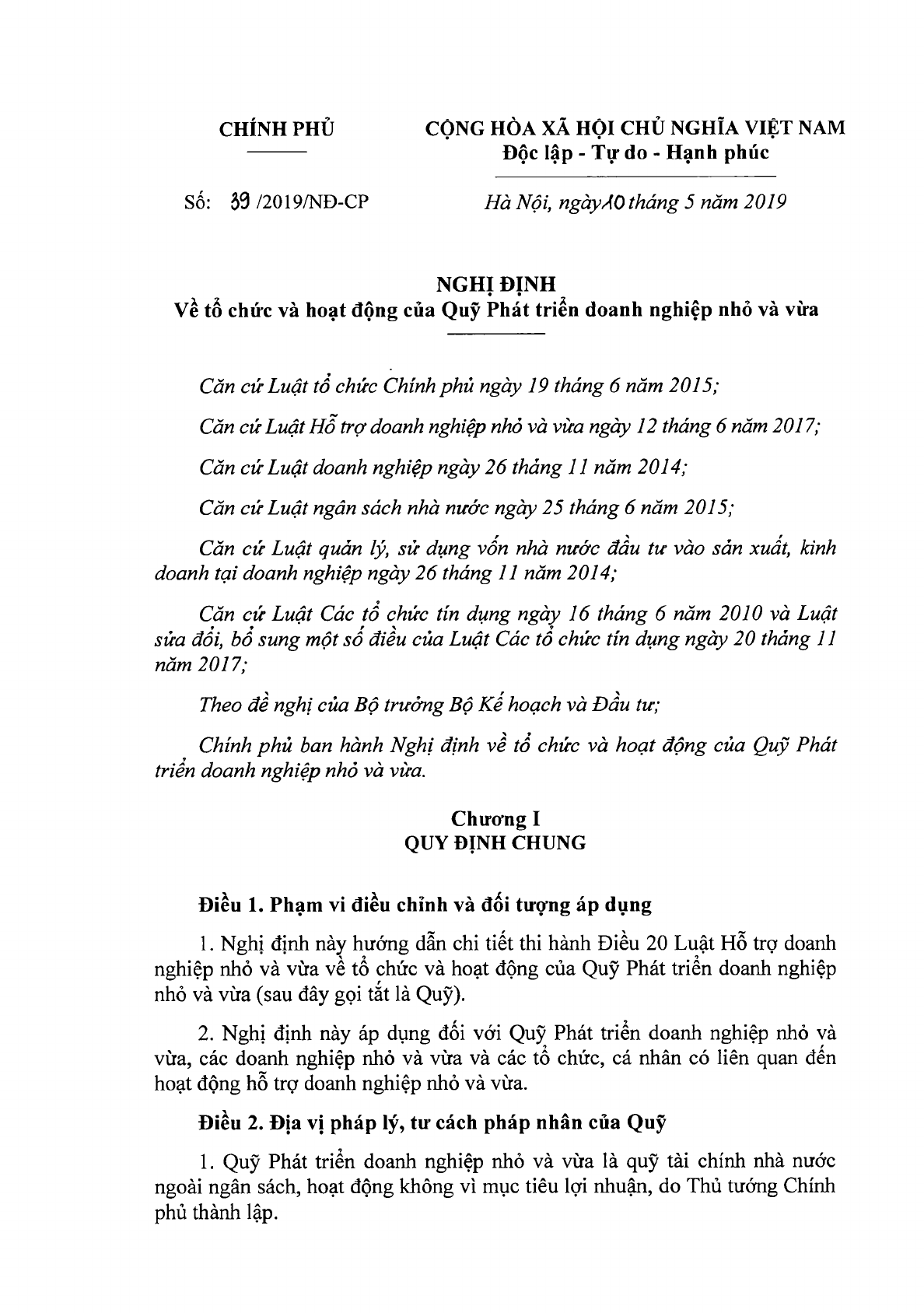 Nghị định 39/2019/NĐ-CP của Chính phủ về tổ chức và hoạt động của Quỹ Phát triển doanh nghiệp nhỏ và vừa.