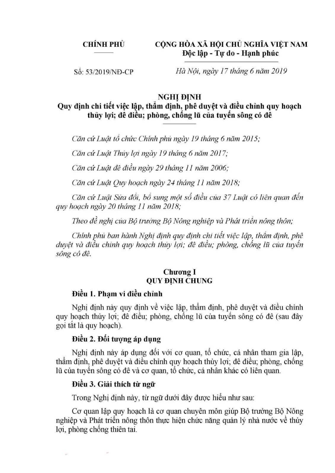 Nghị định 53/2019/NĐ-CP của Chính phủ về việc quy định chi tiết việc lập, thẩm định, phê duyệt và điều chỉnh quy hoạch thủy lợi; đê điều; phòng, chống lũ của tuyến sông có đê.