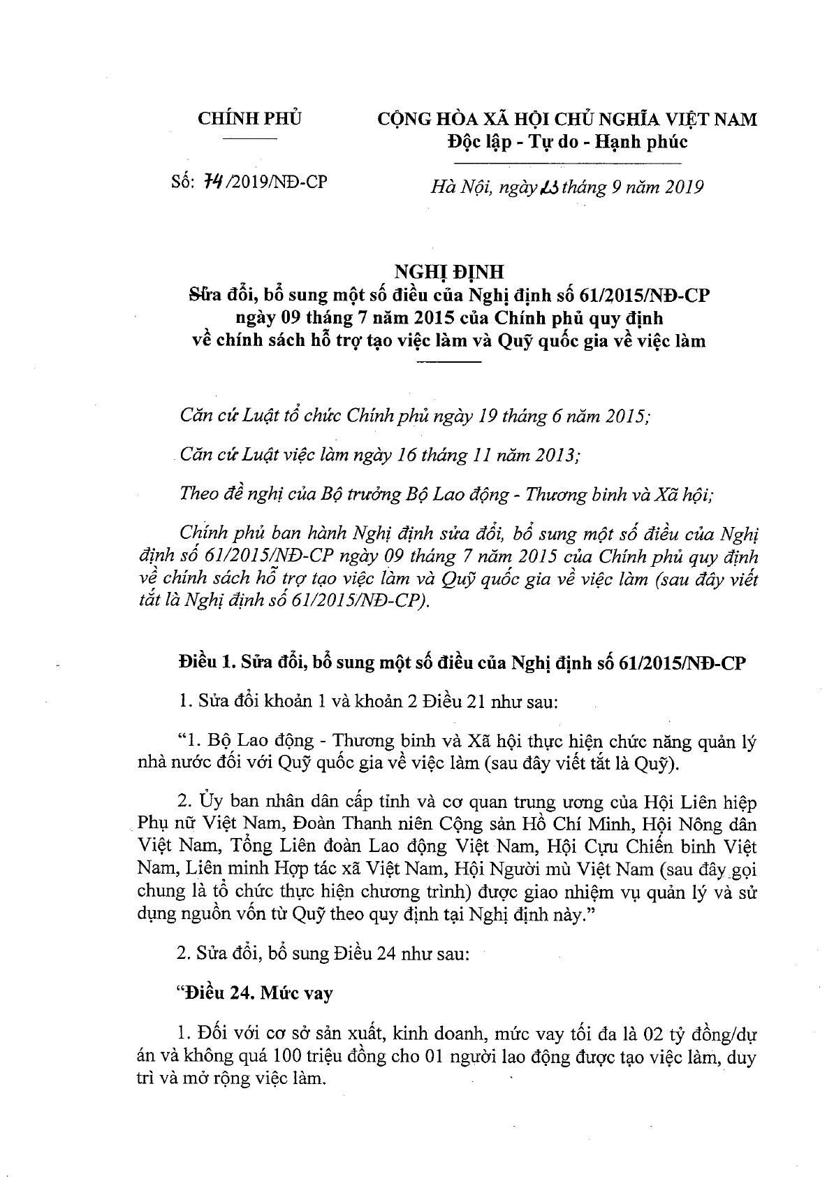 Nghị định 74/2019/NĐ-CP của Chính phủ về việc sửa đổi, bổ sung một số điều của Nghị định 61/2015/NĐ-CP ngày 09/7/2015 của Chính phủ quy định về chính sách hỗ trợ tạo việc làm và Quỹ quốc gia về việc làm.
