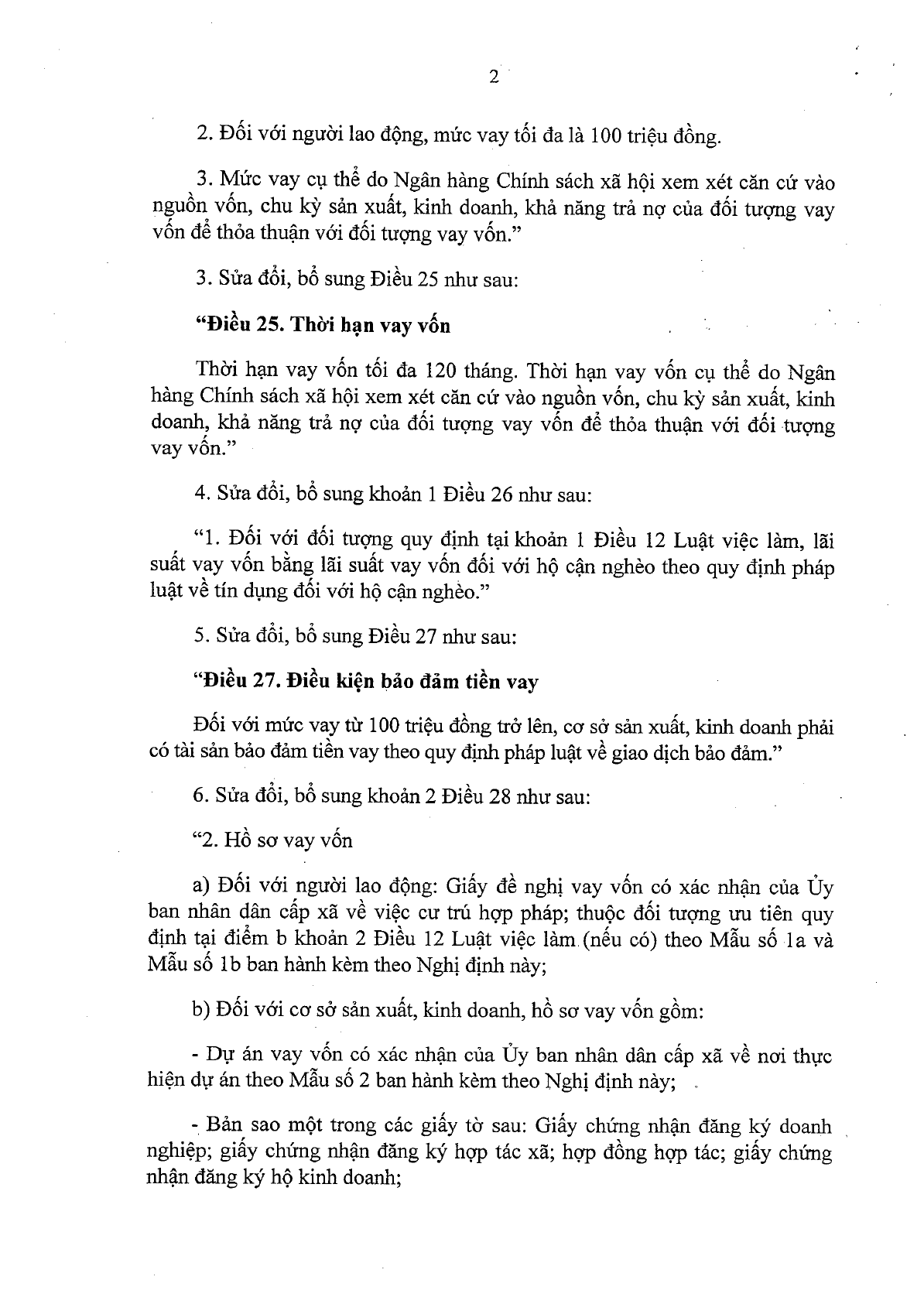 Theo đó, từ ngày Nghị định này có hiệu lực, cơ sở sản xuất, kinh doanh được vay tối đa 02 tỷ đồng/dự án vay vốn từ Quỹ quốc gia về việc làm và không quá 100 triệu đồng cho 01 người lao động được tạo việc làm, duy trì và mở rộng việc làm. Mức vay cụ thể do Ngân hàng Chính sách xã hội xem xét căn cứ vào nguồn vốn, chu kỳ sản xuất, kinh doanh, khả năng trả nợ của đối tượng vay vốn để thỏa thuận với đối tượng vay vốn.