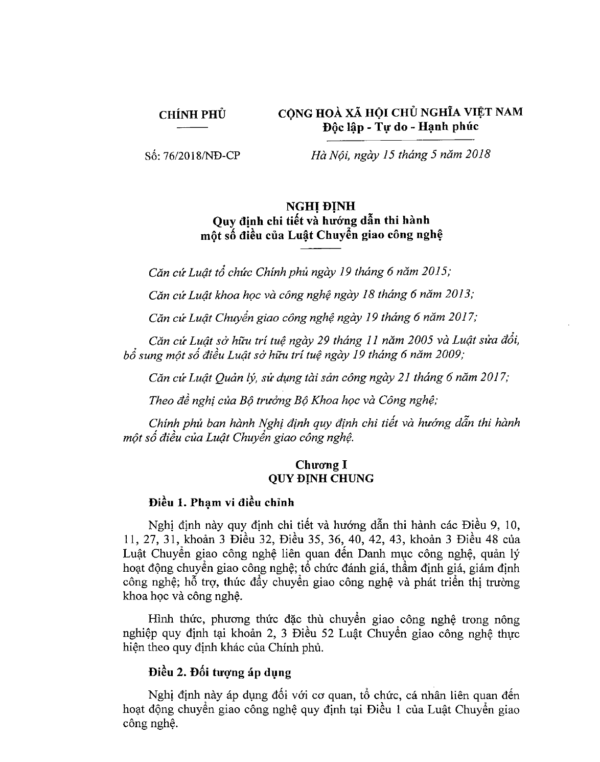 Nghị định 76/2018/NĐ-CP - Hướng dẫn Luật Chuyển giao công nghệ