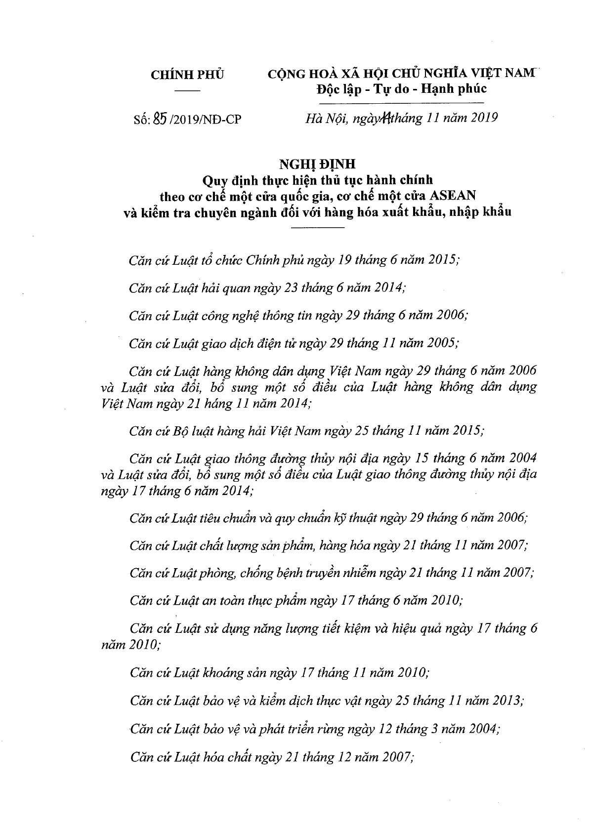 Nghị định 85/2019/NĐ-CP của Chính phủ về việc quy định thực hiện thủ tục hành chính theo cơ chế một cửa quốc gia, cơ chế một cửa ASEAN và kiểm tra chuyên ngành đối với hàng hóa xuất khẩu, nhập khẩu.