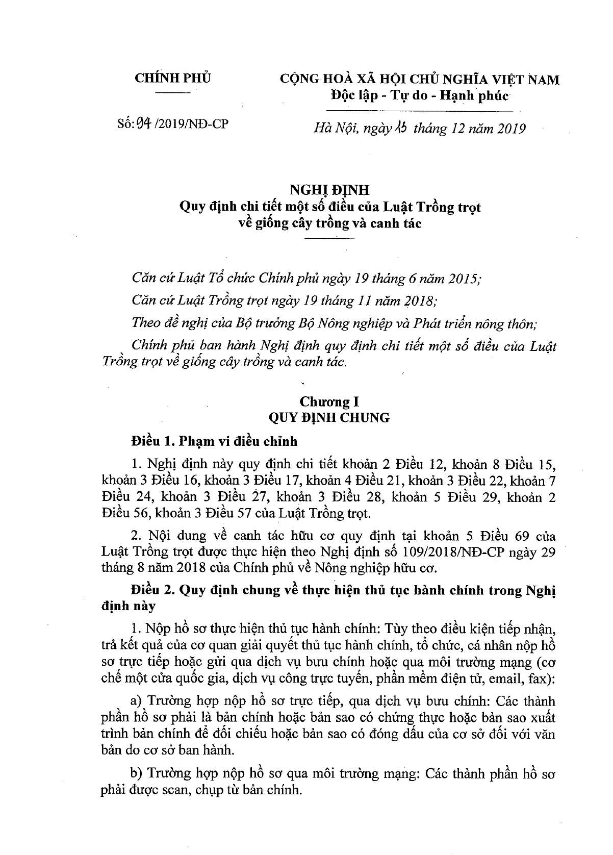 Ngày 13/12/2019, Chính phủ đã ban hành Nghị định 94/2019/NĐ-CP hướng dẫn Luật Trồng trọt về giống cây trồng và canh tác.